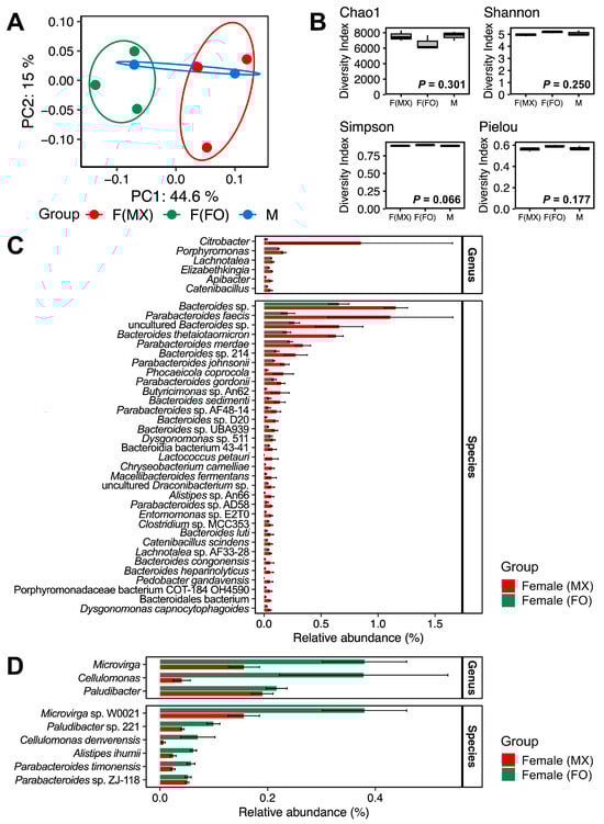 Gut microbiome diversity and composition across experimental groups. (A) PCoA of Bray–Curtis dissimilarities with 95% confidence ellipses. Red represents females from mixed-sex rearing, green represents females from female-only rearing, and blue represents males. (B) Alpha-diversity indices (Chao1 richness, Shannon diversity, Simpson diversity, and Pielou evenness) for females from mixed-sex rearing (F(MX)), females from female-only rearing (F(FO)), and males (M). (C) Relative abundances of gut bacterial genera and species enriched in females from mixed-sex rearing compared with females from female-only rearing. (D) Relative abundances of gut bacterial genera and species enriched in females from female-only rearing compared with females from mixed-sex rearing. Bars show means ± standard errors. Displayed taxa are genera and species that differed significantly in DESeq2 analysis (FDR-adjusted p < 0.05, Benjamini–Hochberg correction). These samples were taken from the females from mixed-sex rearing (F(MX)) and females from female-only rearing (F(FO)), displayed in red and green, respectively.