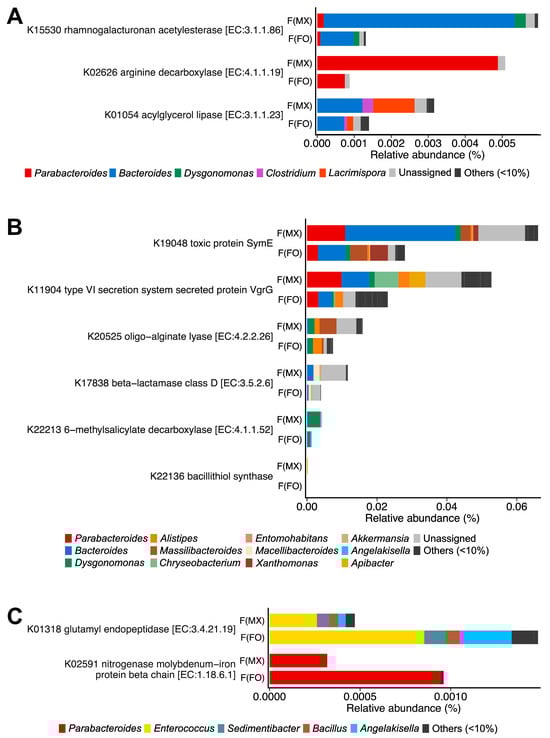 Functional gene differences between experimental groups using KEGG Orthology. Differential abundance of KEGG Orthologs between females from mixed-sex rearing (F(MX)) and females from female-only rearing (F(FO)). (A) Genes involved in nutrient catabolism. (B) Genes linked to interference competition. (C) Genes encoding glutamyl endopeptidase and nitrogenase. Bars are colored by genus-level contributions. Taxa contributing ≥10% in at least one gene are shown, and KEGG orthologs with significant differences in DESeq2 analysis (FDR-adjusted p < 0.05, Benjamini–Hochberg correction) are displayed.