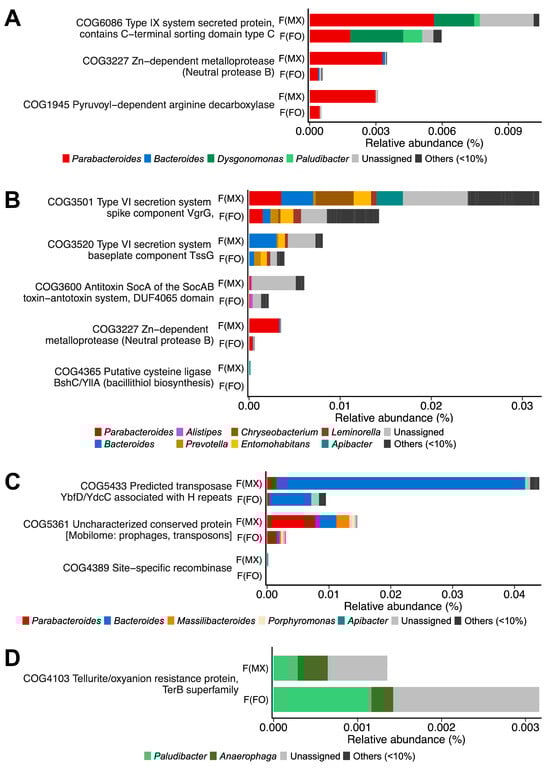 COG-based functional profiling of gut microbiome differences. Differential abundance of COG categories between females from mixed-sex rearing (F(MX)) and females from female-only rearing (F(FO)). (A) Nutrient-catabolism genes, (B) genes related to interference competition, (C) genes linked to mobile element genes, and (D) genes encoding a tellurite/oxyanion resistance protein. Bars are colored by genus-level contributions. Taxa contributing ≥10% in at least one gene are shown, and COGs with significant differences in DESeq2 analysis (FDR-adjusted p < 0.05, Benjamini–Hochberg correction) are displayed.