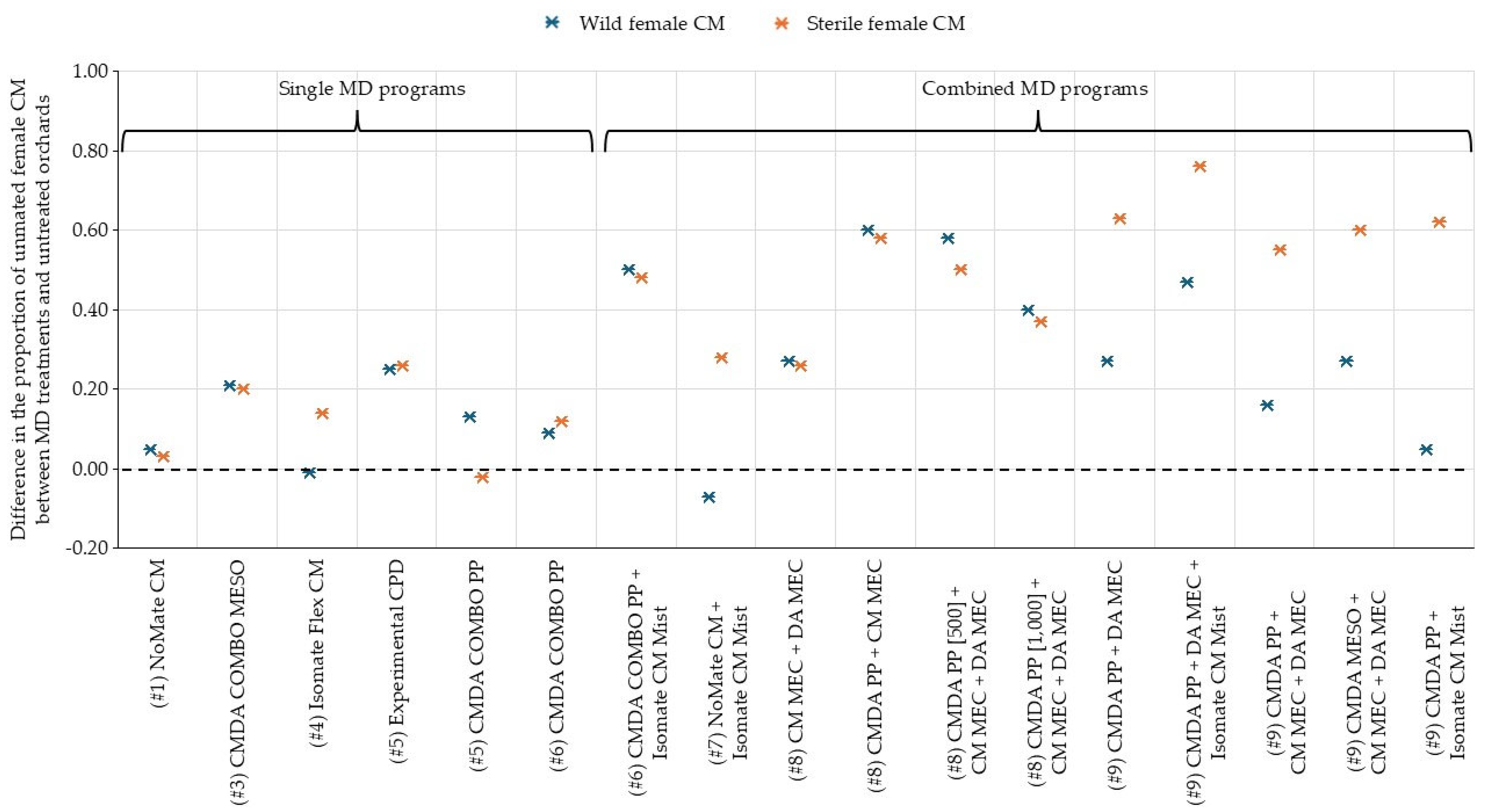 The difference in the proportion of the unmated female CMs between MD treatments and untreated plots varied between wild and sterile moths across this study (Figure 1). The combined MD programs recorded the highest differences (ranging between +0.26 and +0.76 for sterile CMs) compared to single MD programs (maximum +0.26 for sterile CMs).