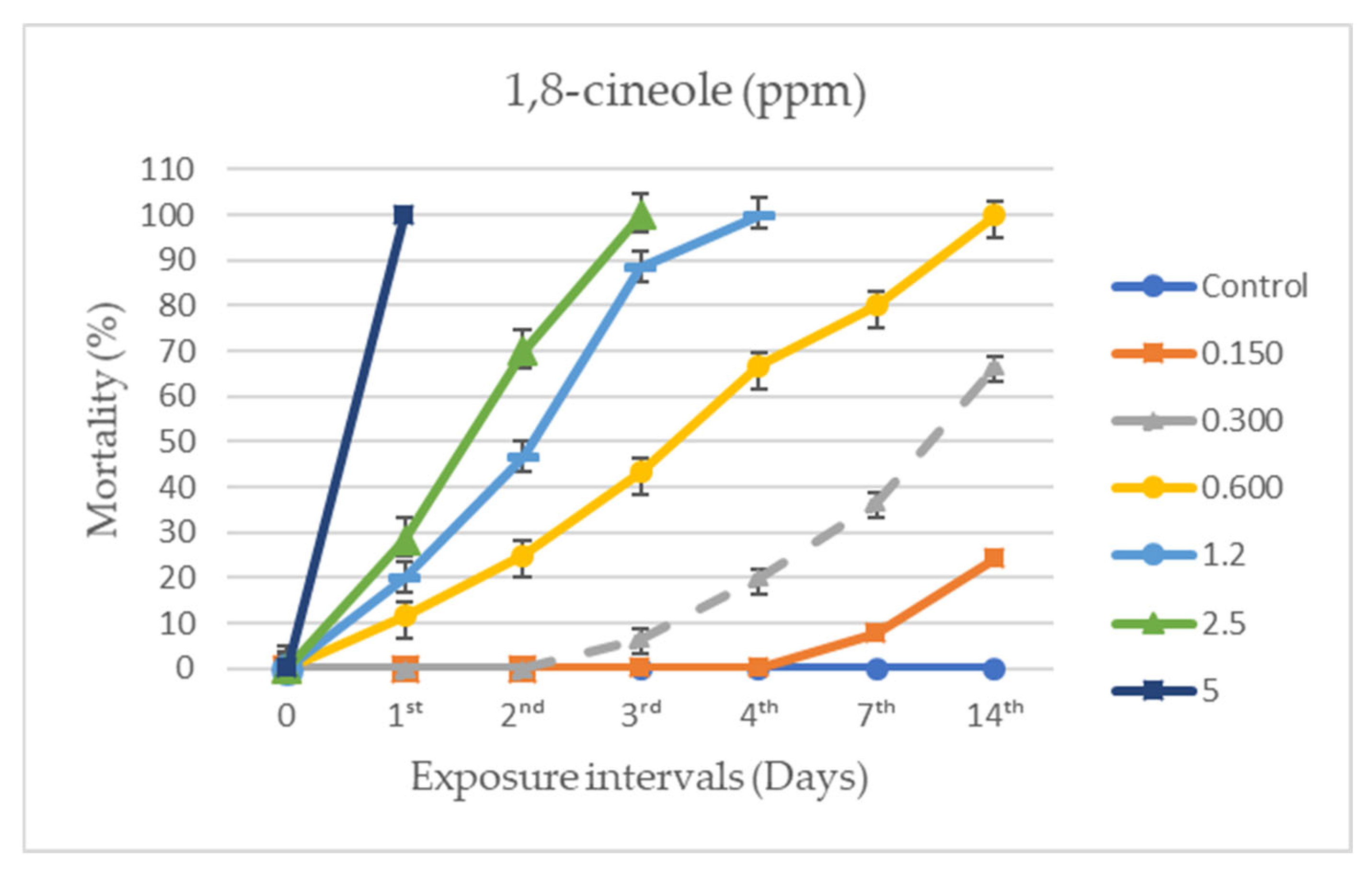 - Aggarwal, K.K.; Tripathi, A.K.; Prajapati, V.; Kumar, S. Toxicity of 1,8-Cineole towards three species of stored product Coleopterans. Insect Sci. Applic. 2001, 21, 155–160. [Google Scholar] [CrossRef]