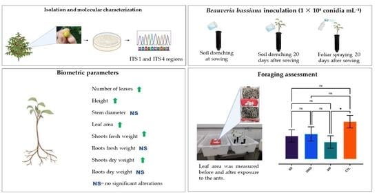 - Ranesi, M.; Vitale, S.; Staropoli, A.; Di Lelio, I.; Izzo, L.G.; De Luca, M.G.; Becchimanzi, A.; Pennacchio, F.; Lorito, M.; Woo, S.L.; et al. Field isolates of Beauveria bassiana exhibit biological heterogeneity in multitrophic interactions of agricultural importance. Microbiol. Res. 2024, 286, 127819. [Google Scholar] [CrossRef]