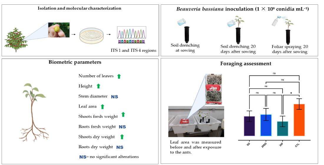 - Zheng, Y.; Liu, Y.; Zhang, J.; Liu, X.; Ju, Z.; Shi, H.; Mendoza-Mendoza, A.; Zhou, W. Dual role of endophytic entomopathogenic fungi: Induce plant growth and control tomato leafminer Phthorimaea absoluta. Pest Manag. Sci. 2023, 79, 4557–4568. [Google Scholar] [CrossRef]