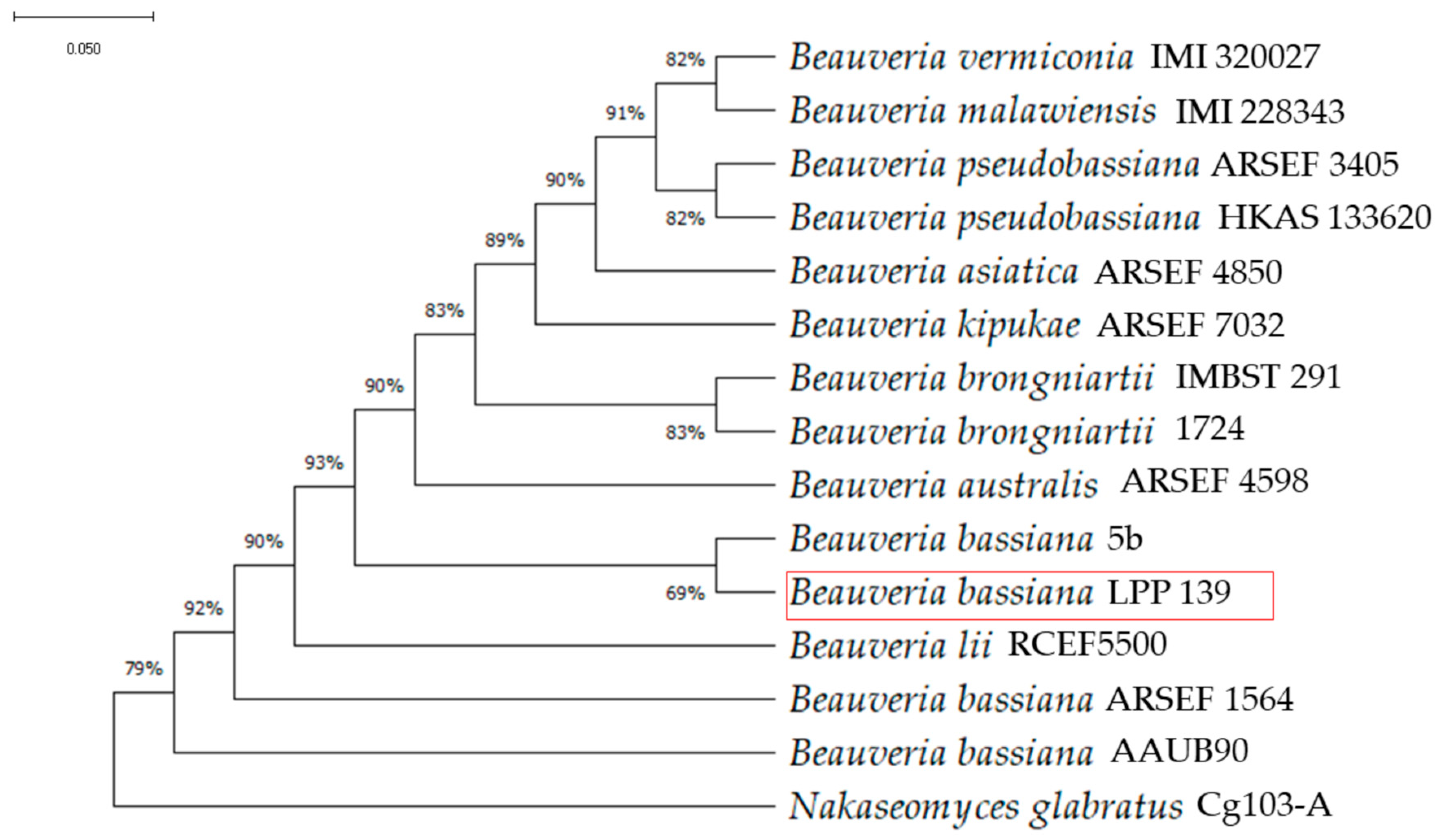 - Liu, L.; Liu, S.; Meng, Q.; Chen, B.; Zhang, J.; Zhang, X.; Lin, Z.; Zou, Z. Evaluating Beauveria bassiana Strains for Insect Pest Control and Endophytic Colonization in Wheat. Insects 2025, 16, 287. [Google Scholar] [CrossRef] [PubMed]