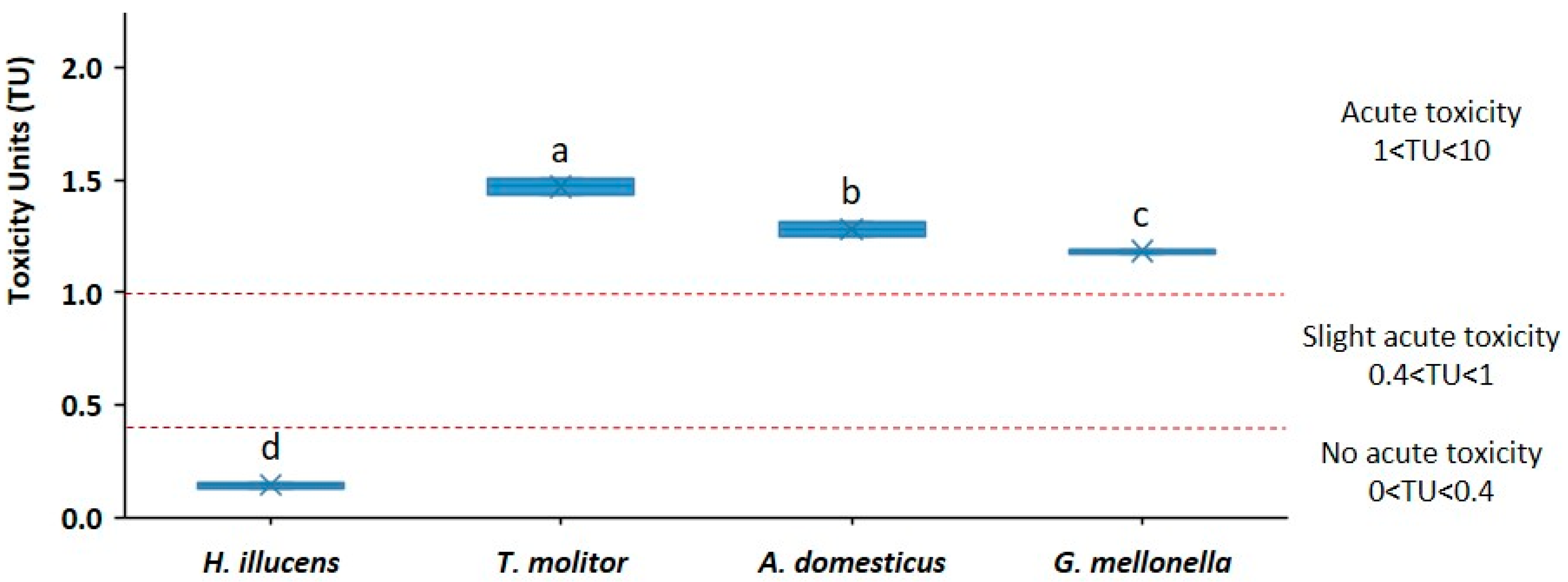 | G. mellonella (n = 4) | 6.74 b | 4.81 a | 82.0 b | 10.4 b | 36.1 b | 8.60 e | 9.60 e |