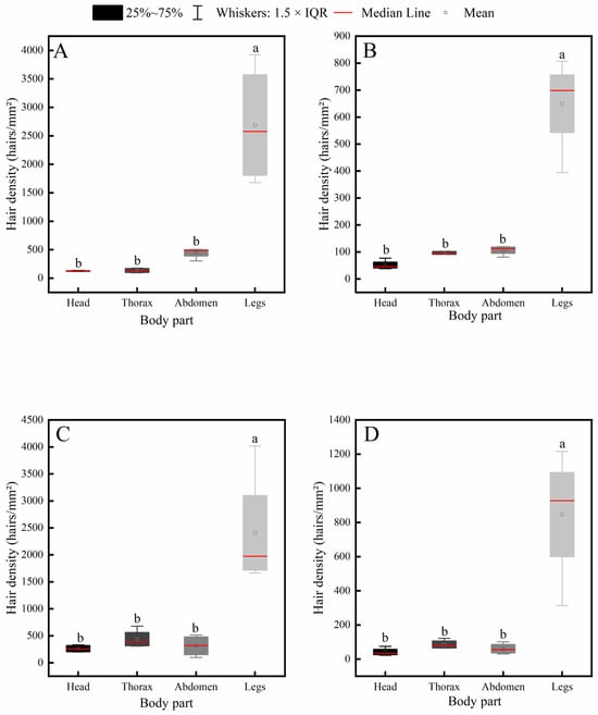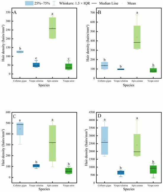 Comparison of hair density on different body parts among four pollinator species. (A) Head, (B) Thorax, (C) Abdomen, (D) Leg. Note: Different lowercase letters indicate statistically significant differences among species within the same body part (p < 0.05). X-axis: species (C. gigas, V. velutina, A. cerana, V. soror). Y-axis: hair density (hairs/mm2).