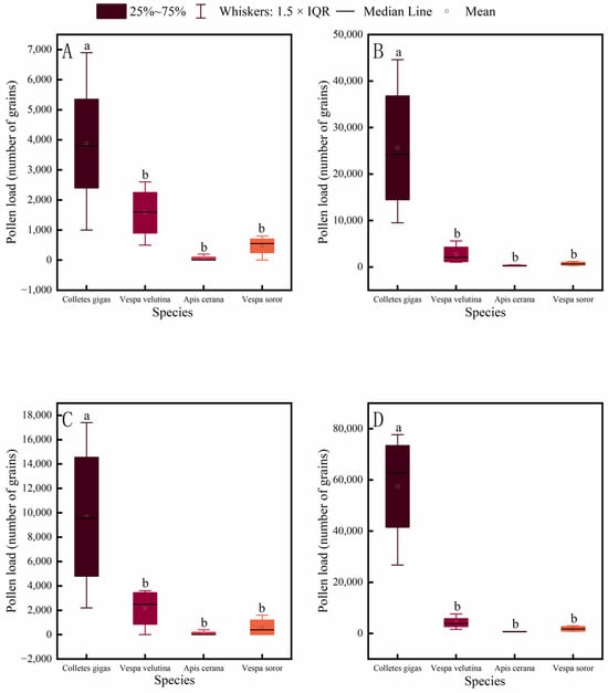 Comparison of pollen load on different body parts among four pollinator species. (A) Head, (B) Thorax, (C) Abdomen, (D) Leg. Note: Different lowercase letters indicate statistically significant differences among species within the same body part (p < 0.05). X-axis: species (C. gigas, V. velutina, A. cerana, V. soror). Y-axis: pollen load (number of grains).