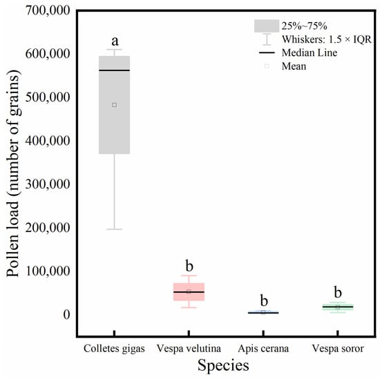 Comparison of total pollen load carried by four pollinator species. Note: Different lowercase letters above the bars indicate statistically significant differences among species at p < 0.05. X-axis: species (C. gigas, V. velutina, A. cerana, V. soror). Y-axis: pollen load (number of grains).