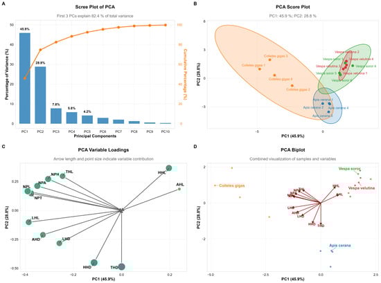 Principal Component Analysis (PCA) of pollen load, hair length, and hair density across body parts of pollinator insects. Note: (A) Scree Plot: Displays the variance explained by each principal component and the cumulative contribution rate. (B) Score Plot: Shows the sample clustering of four pollinator insect species based on PC1 and PC2, with colored ellipses representing 95% confidence intervals. (C) Variable Loadings Plot: The length of arrows and size of points reflect the contribution intensity of traits (e.g., pollen load, hair length/density) to PC1 and PC2. (D) Biplot: Integrates sample distribution and variable loadings to intuitively visualize the association between species clustering and traits.