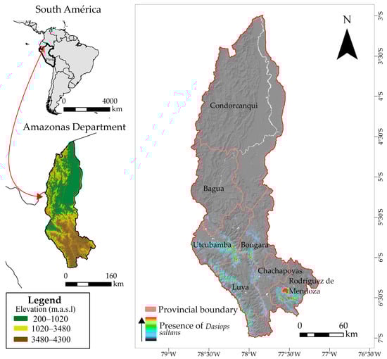 The records of Dasiops saltans presence used in this study were provided directly by agricultural producers in the provinces of Rodríguez de Mendoza and Bongará. In total, 17 occurrence points were collected in Rodríguez de Mendoza and 35 points in Bongará, corresponding to confirmed reports in crop areas where the species was observed. Each record was georeferenced using coordinates provided by the producers or verified in the field, which allowed the sites of occurrence to be accurately located.
