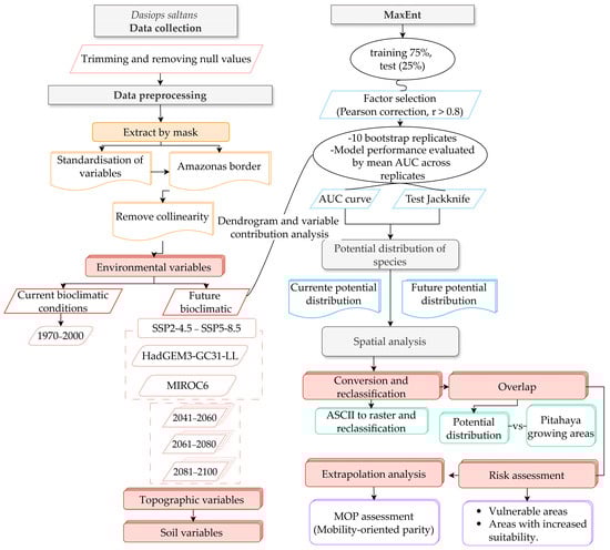 As shown in Figure 2, the flowchart integrates data pre-processing, multicollinearity reduction, MaxEnt model evaluation, and spatial projection of the potential distribution of Dasiops saltans in multiple climate scenarios.