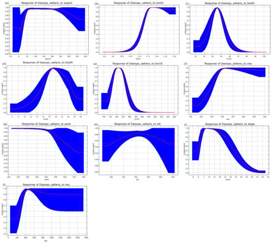 Response curves of the environmental variables that contributed most to the MaxEnt models. (a) Appearance; (b) average diurnal range (bio-02); (c) temperature seasonality (bio-4); (d) average temperature of the driest quarter (bio-09); (e) precipitation of the warmest quarter (bio-18); (f) clay content; (g) sand content; (h) silt content; (i) terrain slope; and (j) organic carbon content of the final soil fraction.