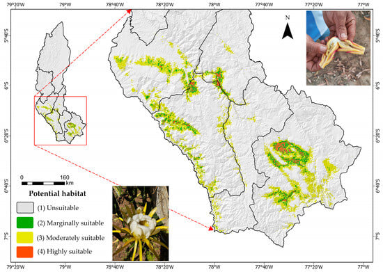 As shown in Figure 5, the current potential distribution of Dasiops saltans is mainly concentrated in environmentally suitable areas within the Amazonas region, highlighting zones classified as highly and moderately suitable.