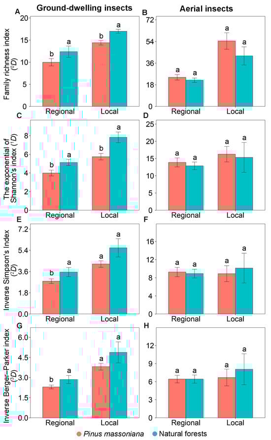 Diversity indices of ground-dwelling (A,C,E,G) and aerial (B,D,F,H) insects in Pinus massoniana plantations and natural forests at the regional scale across Guangxi, China and at the local scale at Yachang, Guangxi, China. Different letters at the same scale indicate significant differences between the two forest types at p < 0.05.