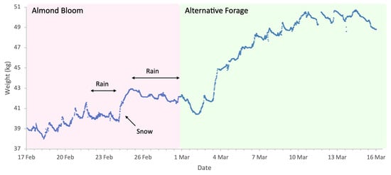 In this study, the deployment of in-field sensor (IFS) mesh showed that honey bee presence in the almond orchard was strongly influenced by the meteorological conditions and almond forage (Figure 5). Bee activity was consistently high from mid-February to 2 March 2024 except during rainfall. After 2 March, activity declines significantly, corresponding to the end of bloom. The weight increase on 7 March (Figure 5) is a result of rain rather than incoming forage.
