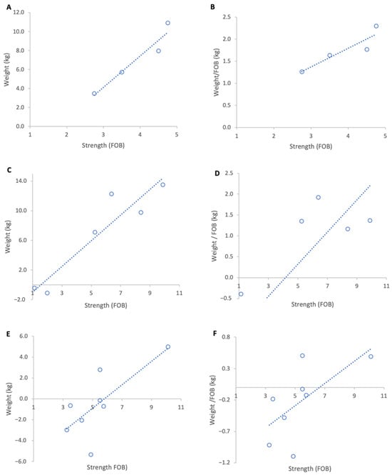 Relationship between colony strength and colony weight gain for three genetic lines from 17 February to 15 March 2023. (A) Pol-line total weight gain, (B) Pol-line weight gain normalised per FOB, (C) Russian total weight gain, (D) Russian weight gain normalised per FOB, (E) stock total weight gain, (F) stock weight gain normalised per FOB. Circles represent individual colony data points; dotted lines indicate fitted linear relationships.