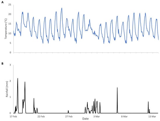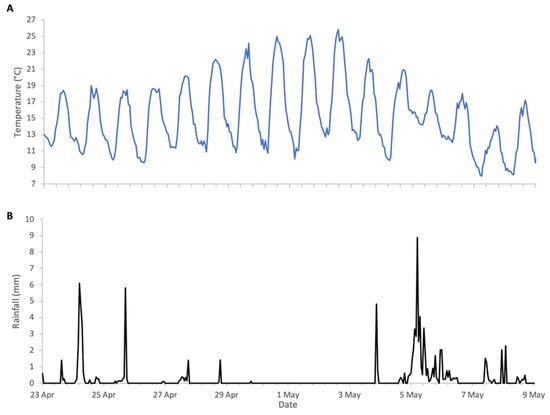 Weather conditions during Robinia 2025 study: (A) ambient temperature, (B) rainfall.