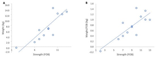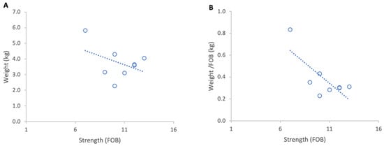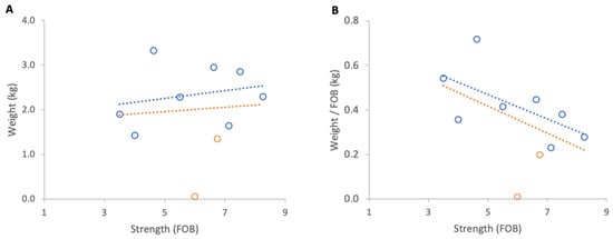 Relationship between colony strength and colony weight loss from 4 to 14 March 2024: (A) total weight loss per colony, (B) weight loss normalised per FOB. Circles represent individual colony data points; dotted lines indicate fitted linear relationships.