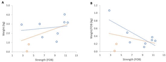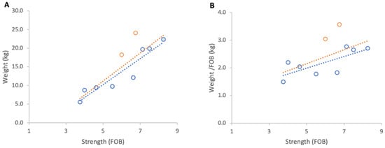 Relationship between colony strength and colony weight gain from 1 to 7 June 2025: (A) total weight loss per colony, (B) weight loss normalised per FOB. Circles represent individual colony data points; blue circles indicate colonies headed by one-year-old queens and orange circles indicate colonies headed by same-season queens. Dotted lines indicate fitted linear relationships; the orange dotted line includes all colonies, whereas the blue dotted line excludes colonies headed by same-season queens.