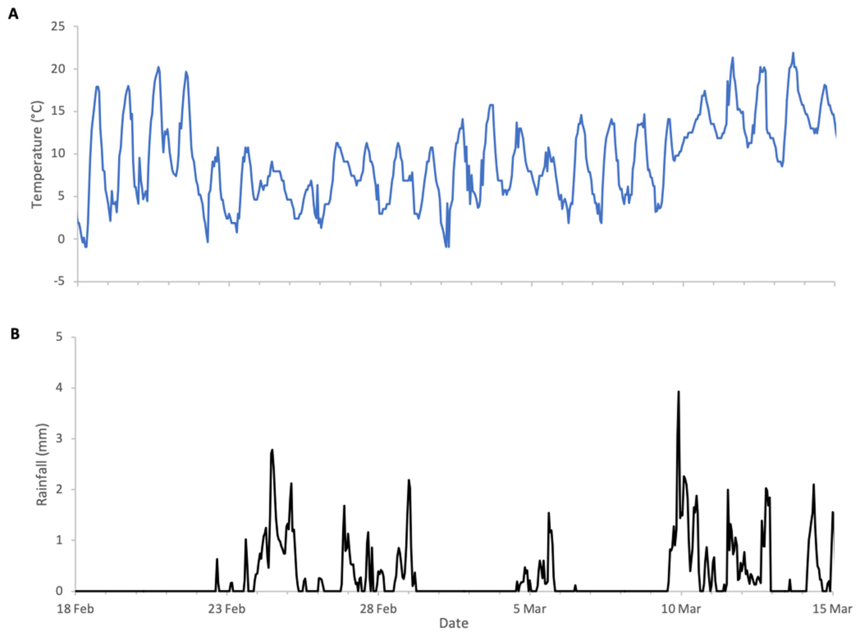 Figure 1) with low ambient temperatures and frequent, abundant precipitation particularly during peak bloom (18 to 27 February field visual observations) including snowfall on 24 of February. This event is clearly visible in