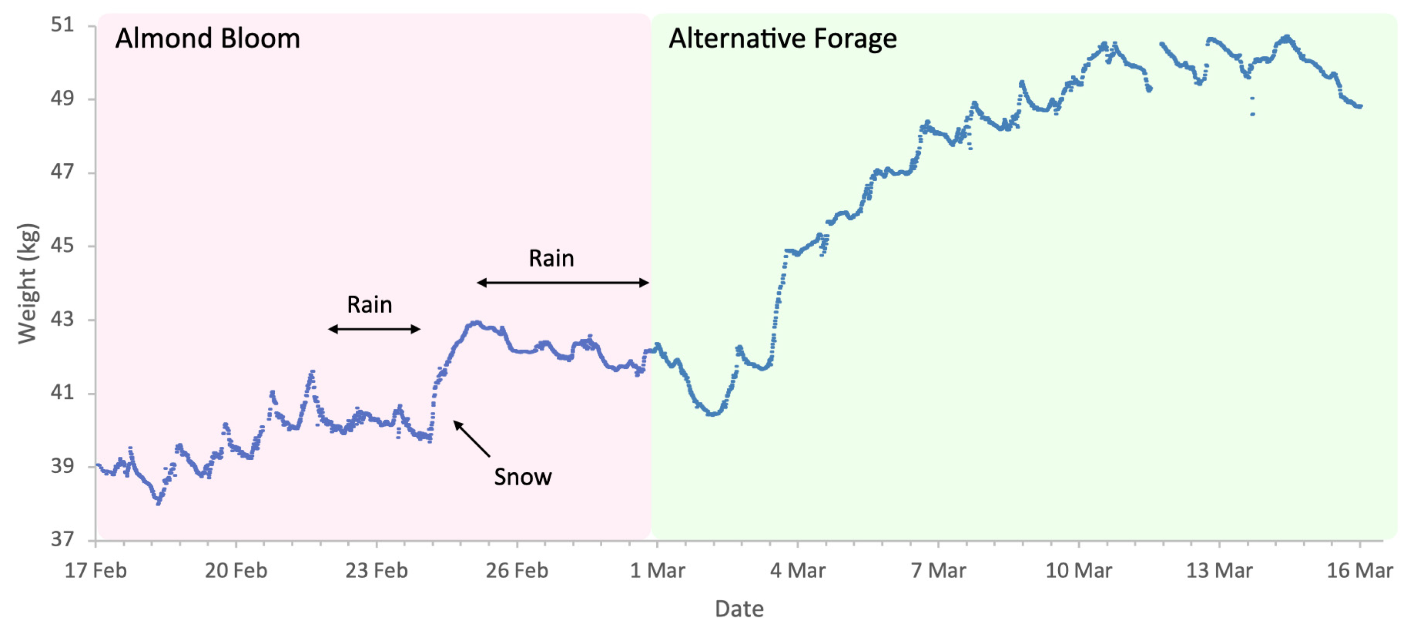 Figure 2, as it produced an atypical increase in hive weight, even in the absence of bee activity. Although more favourable weather followed, most almond bloom had already finished. Nonetheless, we observed significant post-bloom colony weight increases after 4 March 2023 (