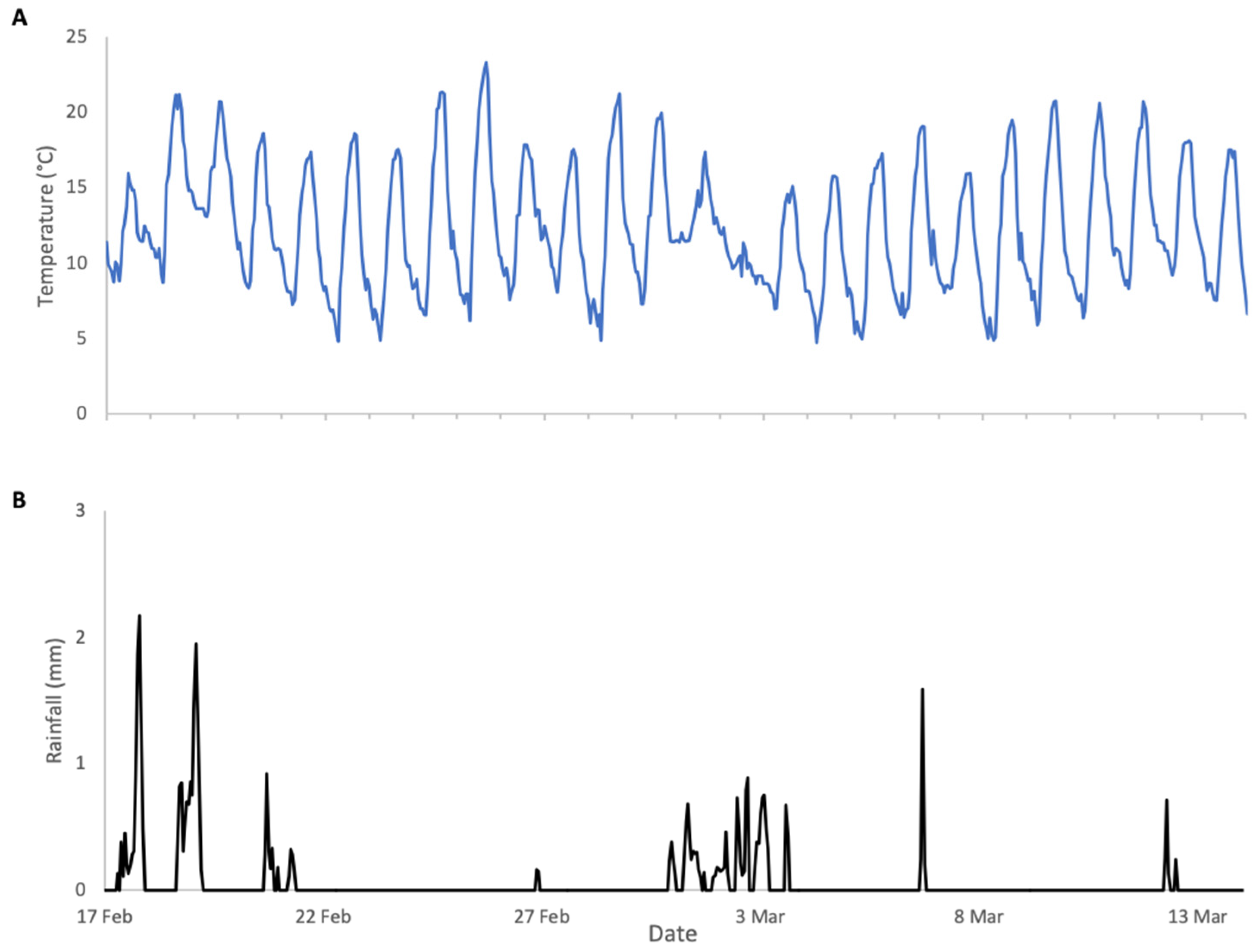 Figure 5). Bee activity was consistently high from mid-February to 2 March 2024 except during rainfall. After 2 March, activity declines significantly, corresponding to the end of bloom. The weight increase on 7 March (