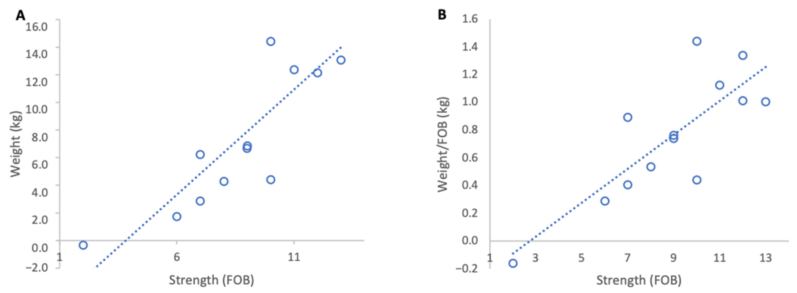 Differences between Strong and Weak groups were tested using non-parametric Mann–Whitney U tests (two-tailed, α = 0.05), as group sizes were small and weight gain data per group were not normally distributed. Statistical comparisons were performed on absolute weight gains, not efficiency ratios, to avoid ratio variance artefacts arising from variability in the denominator (FOB), which can artificially increase variance and affect the interpretation of group differences.