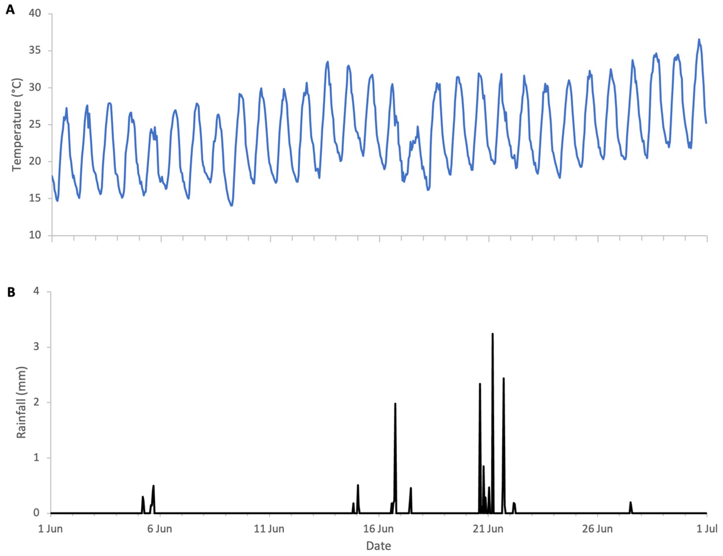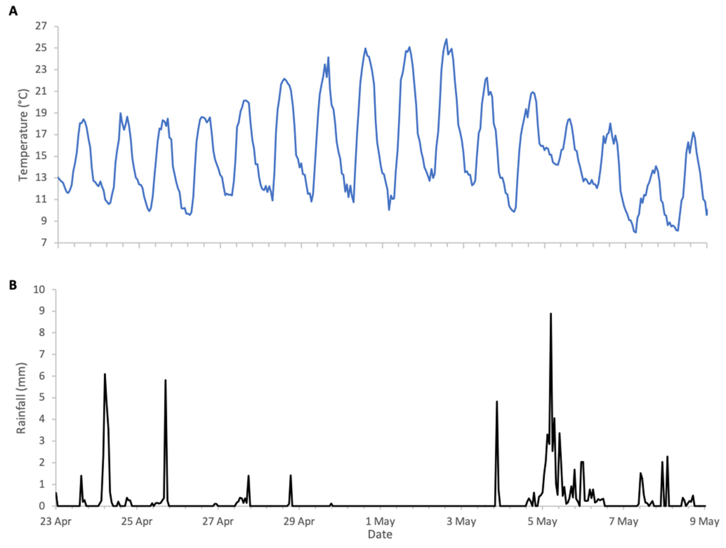 A single weather pack was installed at a central location near the bee hives in all four trials. It measured ambient temperature (±0.5 °C accuracy) and rainfall using a self-emptying tipping-bucket rain gauge, allowing classification of rainfall intensity. Unlike fixed-chamber rain gauges, a self-emptying gauge does not require manual emptying. The unit was powered using an LP952040 800 mAh lithium-polymer battery, providing several months of operation, and was charged via an onboard USB port.