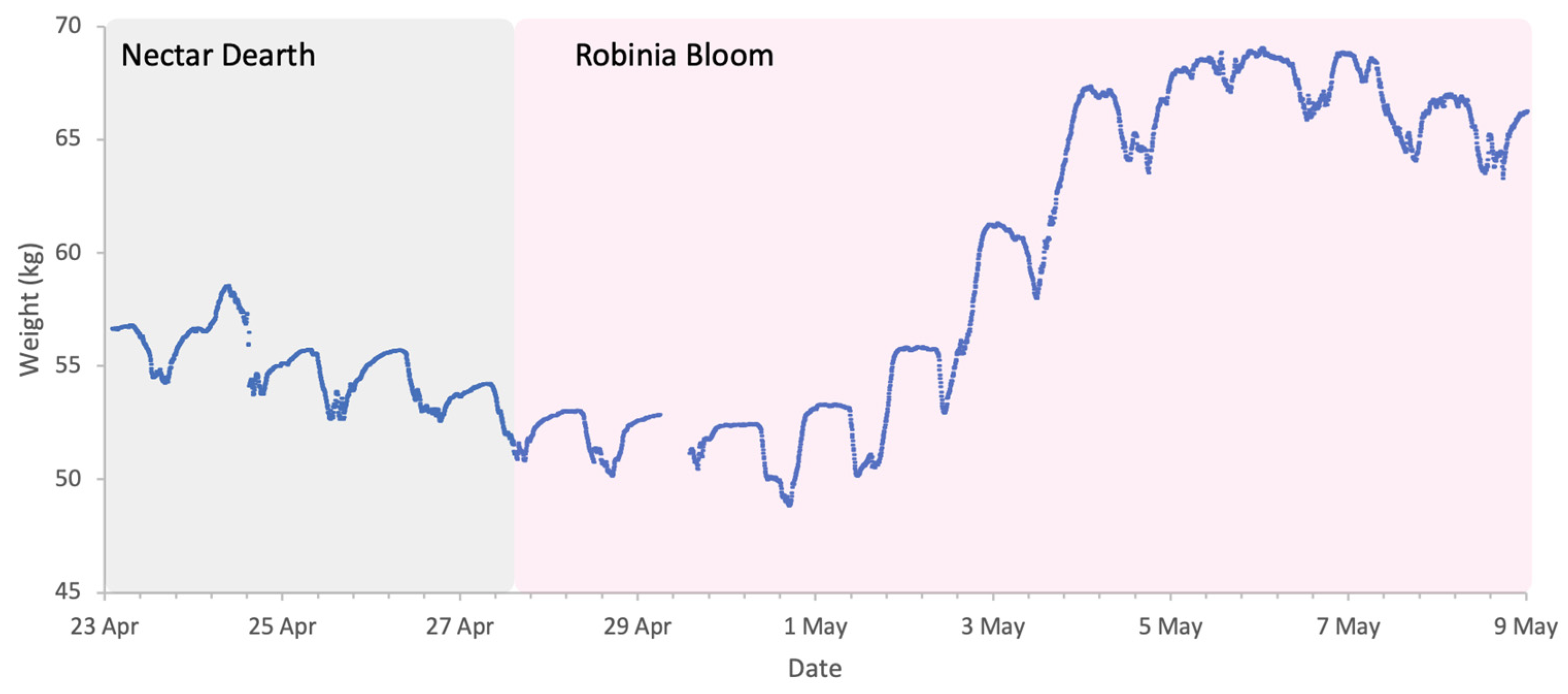 Robinia typically offers a heavy nectar flow and marks the peak of colony development in the Apennine foothills of Central Italy. However, during our study, weather conditions at the onset of bloom were unstable, disrupting both bee activity and nectar production. Due to the large size of colonies at that time, breaks in forage availability resulted in weight losses driven by sharp increases in the consumption of in-hive stored resources. Low nighttime temperatures at this time of year increase a colony’s metabolic demand as it maintains temperature homeostasis. Our Robinia 2025 dataset yielded a significant negative relationship between colony strength and weight loss per FOB (R2 = 0.60, p = 0.02), indicating that stronger colonies were better able to limit proportional weight losses during this period.