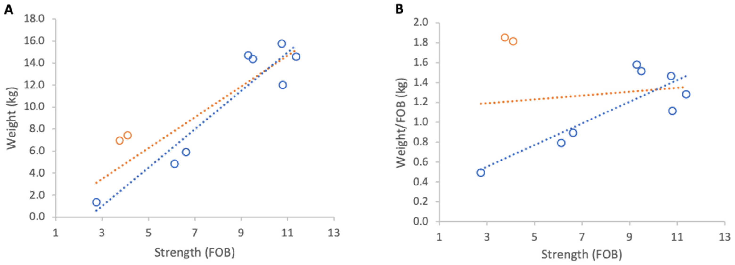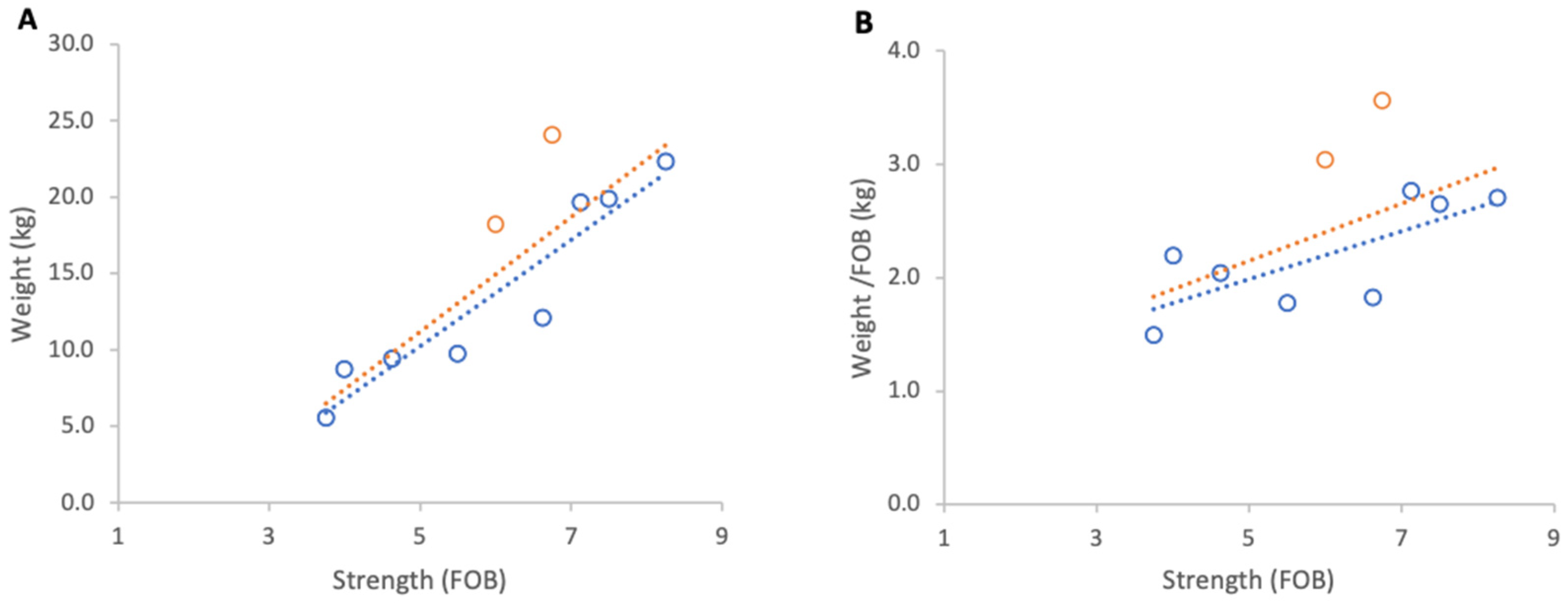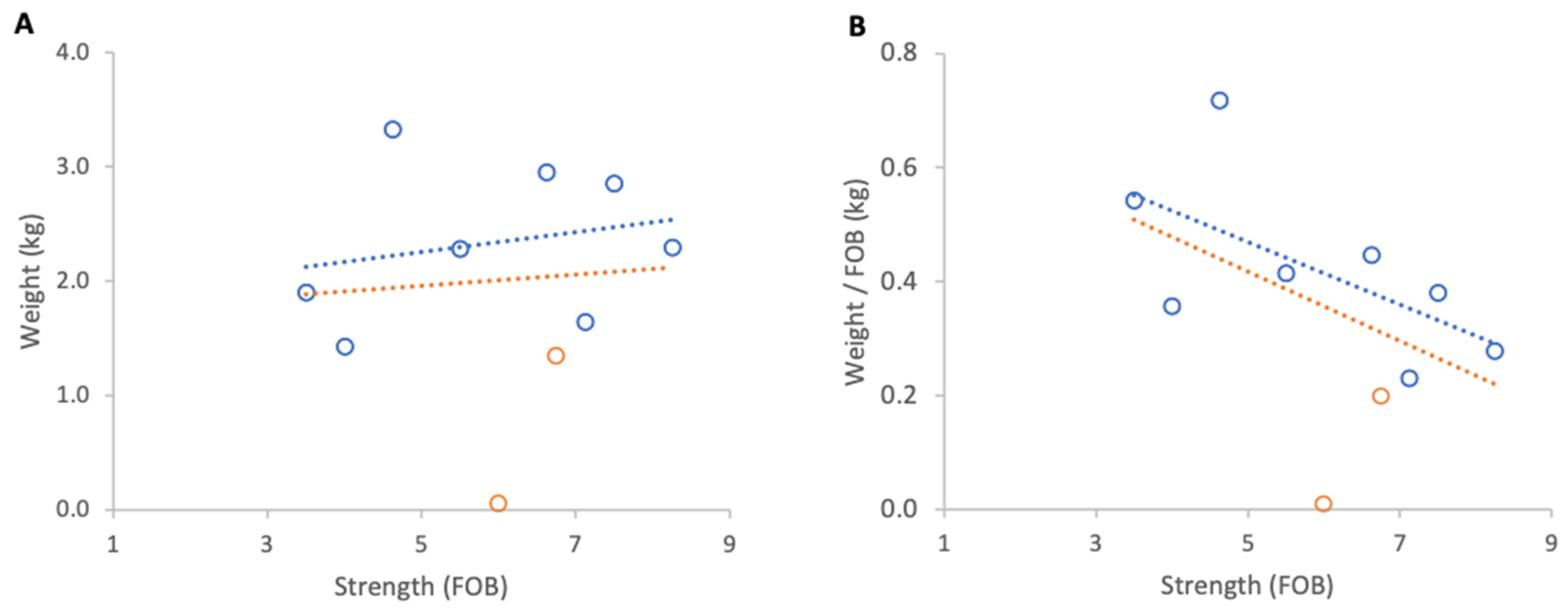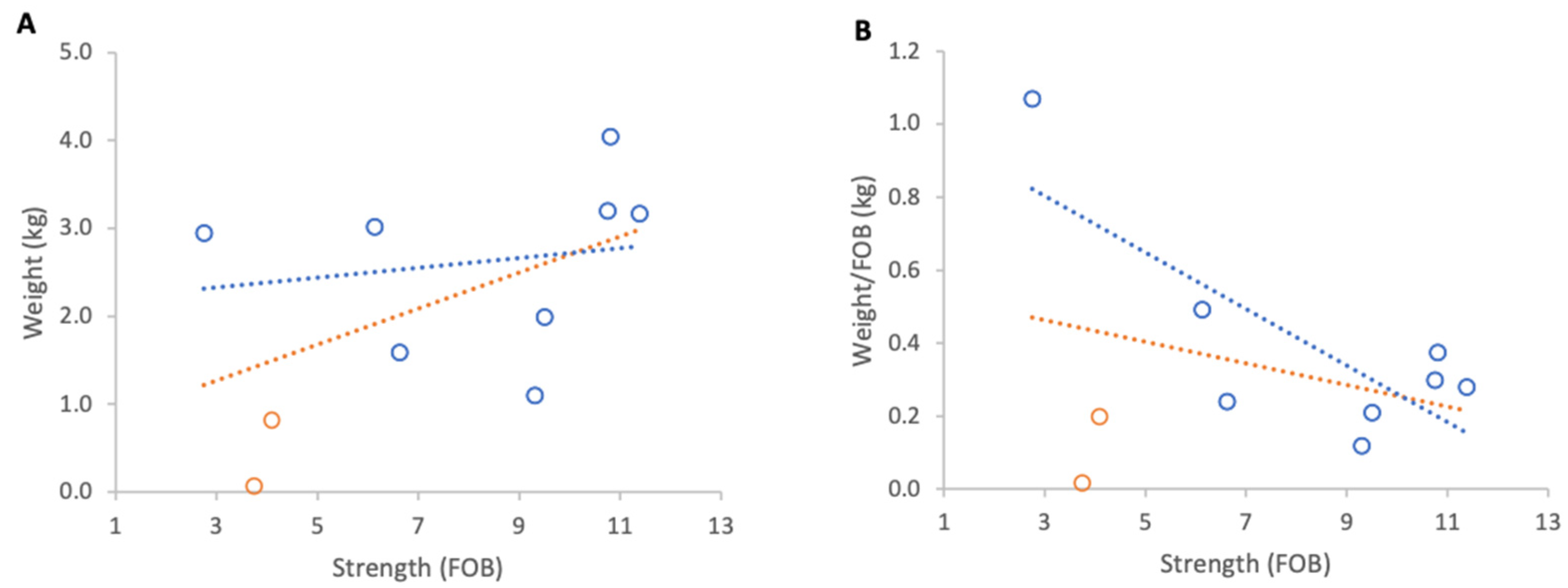 Figure 3B) and a strong positive, but non-significant association between colony strength and weight per FOB (