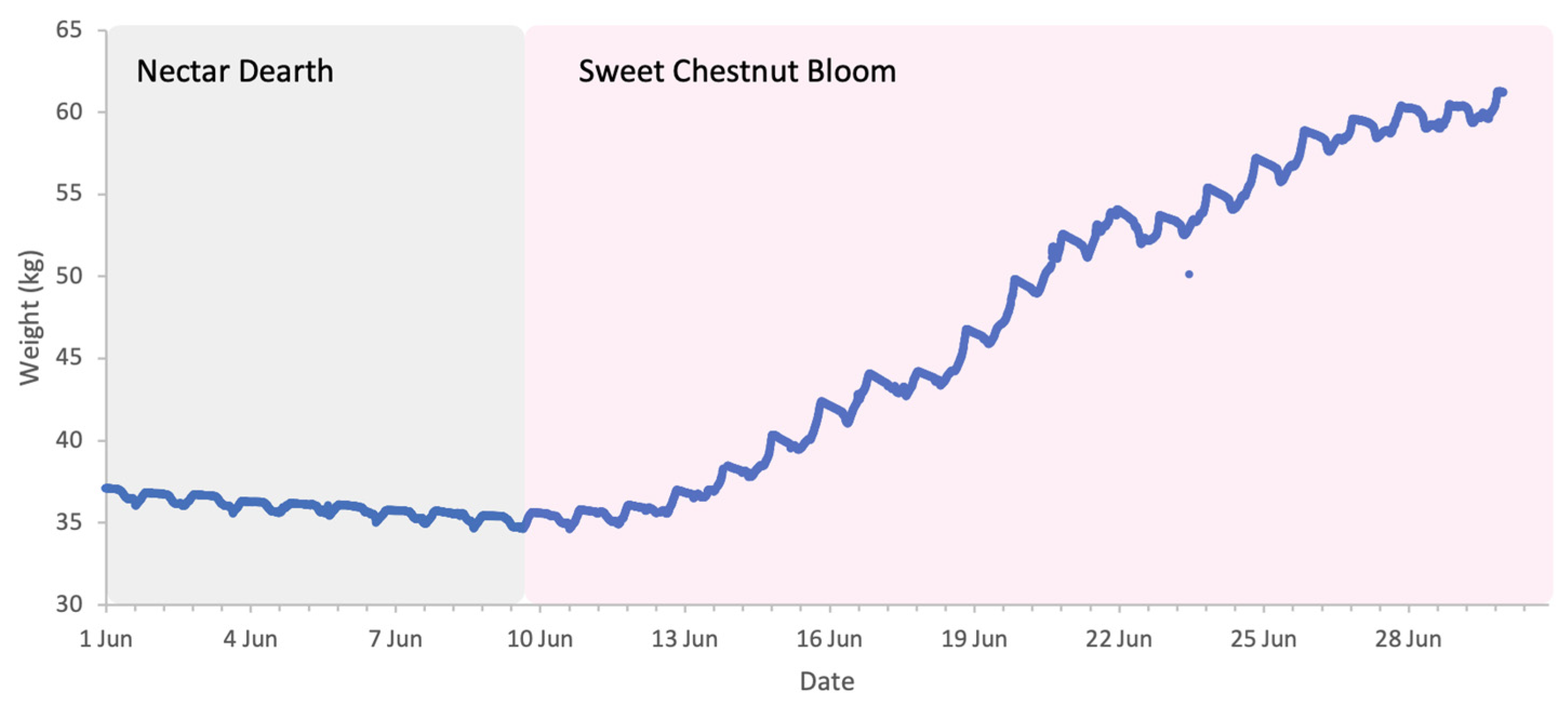 Prior to the start of sweet chestnut bloom, from 1 to 7 June 2025, there was a short dearth in forage and all colonies exhibited a net loss in weight. Absolute losses showed no relationship with colony strength (