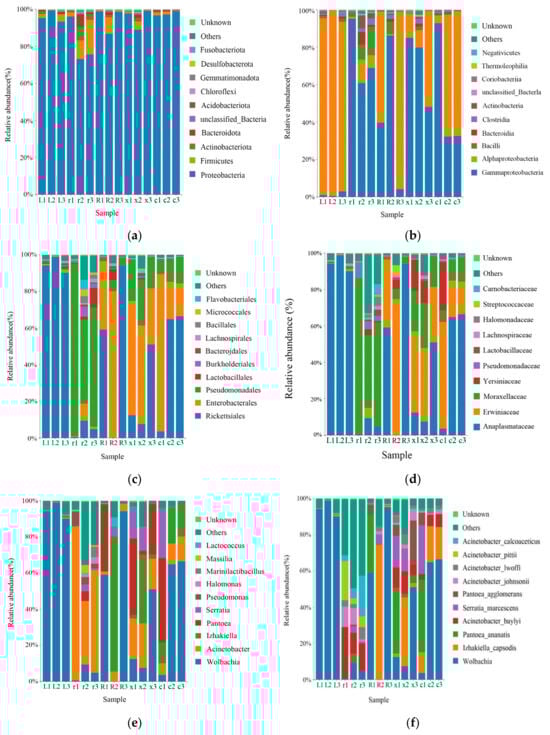 Relative abundance of the top 10 gut bacteria at the phylum, class, order, family, genus, and species levels in different developmental stages of the L. pratensis: (a) relative abundance at the phylum level; (b) relative abundance at the class level; (c) relative abundance at the order level; (d) relative abundance at the family level; (e) relative abundance at the genus level; and (f) relative abundance at the species level.