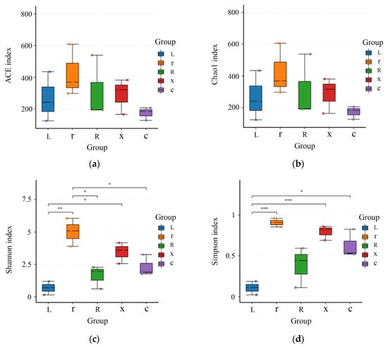Analysis of gut bacterial alpha diversity at different developmental stages of the L. pratensis: (a) ACE index: Abundance-based coverage estimates are indices used to estimate the number of species in a community; (b) Chao1 index: One of the measures of species richness; (c) Shannon index: Used to estimate one of the microbial diversity indices in the sample; and (d) Simpson index: Used to estimate one of the microbial diversity indices in the sample. The abscissa is the group name, and the ordinate is the corresponding alpha diversity index. In the box line diagram, the meaning of each symbol is as follows: the upper and lower end lines of the box: the upper and lower quartile range (IQR); median line: median; upper and lower edges: maximum and minimum peripheral value (1.5 times IQR); and points outside the upper and lower edges: represents an outlier. The number on the line between the columns is the p value of the t test (if the p value > 0.05, the p value is not displayed by default). * indicates a significant difference (p < 0.05), ** indicates a highly significant difference (p < 0.01), *** indicates an extremely significant difference (p < 0.001).