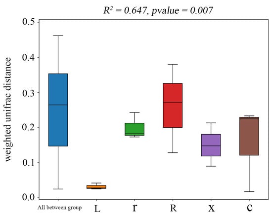 PERMANOVA of gut bacterial communities at different developmental stages of L. pratensis. Note: Sitting indicates Beta distance; the box plot above “All between group” represents the Beta distance data of samples between all groups; and the following box plots are the Beta distance data between samples in different groups. The R2 obtained by PERMANOVA analysis indicates the degree of interpretation of the difference between different groups of samples, that is, the ratio of group variance to total variance. The greater the R2, the higher the degree of interpretation of the difference between the groups, and the greater the difference between the groups. When the p-value is less than 0.05, the test is reliable.
