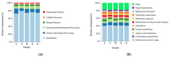 The KEGG (Kyoto Encyclopedia of Genes and Genomes) functional prediction analysis showed that at the first-level functional level (Figure 6a), metabolism (75.21%), genetic information processing (9.46%), environmental information processing (6.88%), human diseases (3.82%), cellular processes (2.95%), organismal systems (1.69%) and genetic information processing (9.46%) were the dominant functional groups. The prediction showed that the abundance of metabolic pathways accounted for the largest share of the abundance of all first-order pathways, suggesting that the gut microbiota of L. pratensis primarily metabolizes various substances. Functional prediction showed that at the secondary level of the KEGG metabolic pathway (Figure 6b), there was no significant difference in the secondary metabolic pathways involved in gut microbiota between samples. The gut bacteria of L. pratensis at different developmental stages were mainly involved in global and overview maps (40.67%), carbohydrate metabolism (7.88%), amino acid metabolism (5.89%), and energy metabolism (4.98%) at the secondary classification level. It is predicted that gut bacteria play an important role in host metabolism. However, gene function predictions cannot fully reflect the actual functions of the intestinal bacterial population in L. pratensis, and these predicted functions need further analysis and verification.