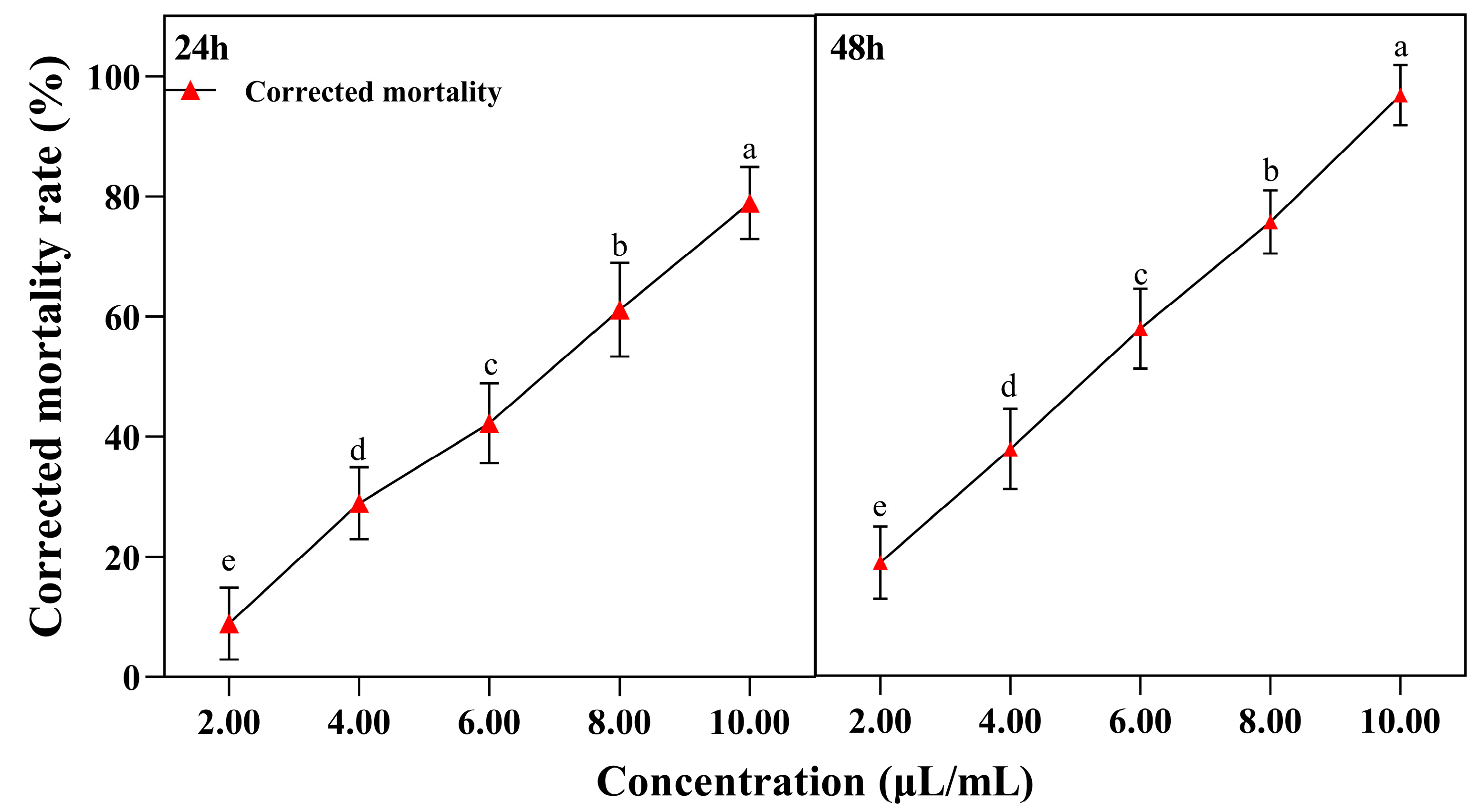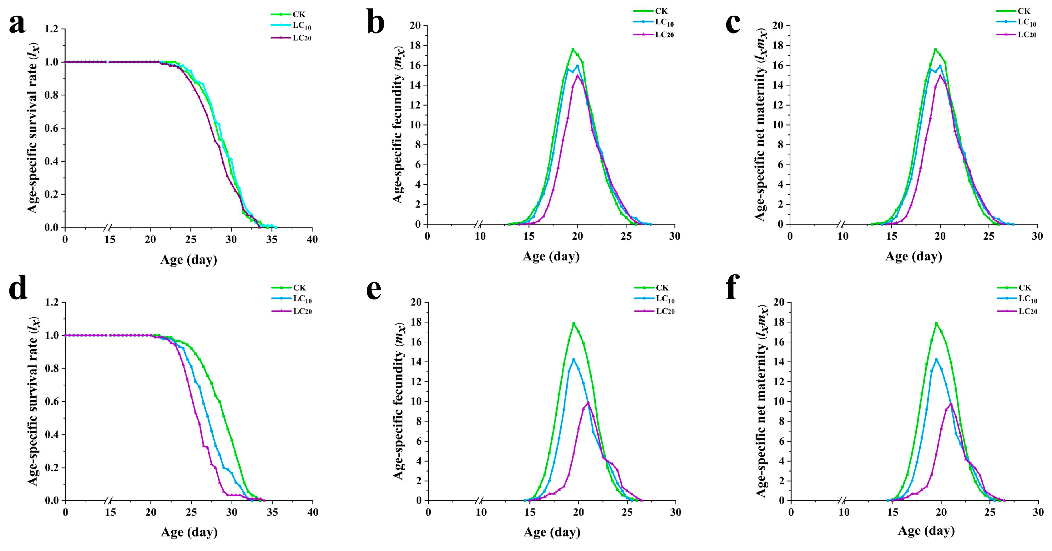 55]. The above studies have shown that essential oils have significant effect on the population parameters of pests. Although varying degrees of impact on population parameters were observed in the two treatment groups subjected to sublethal concentrations of