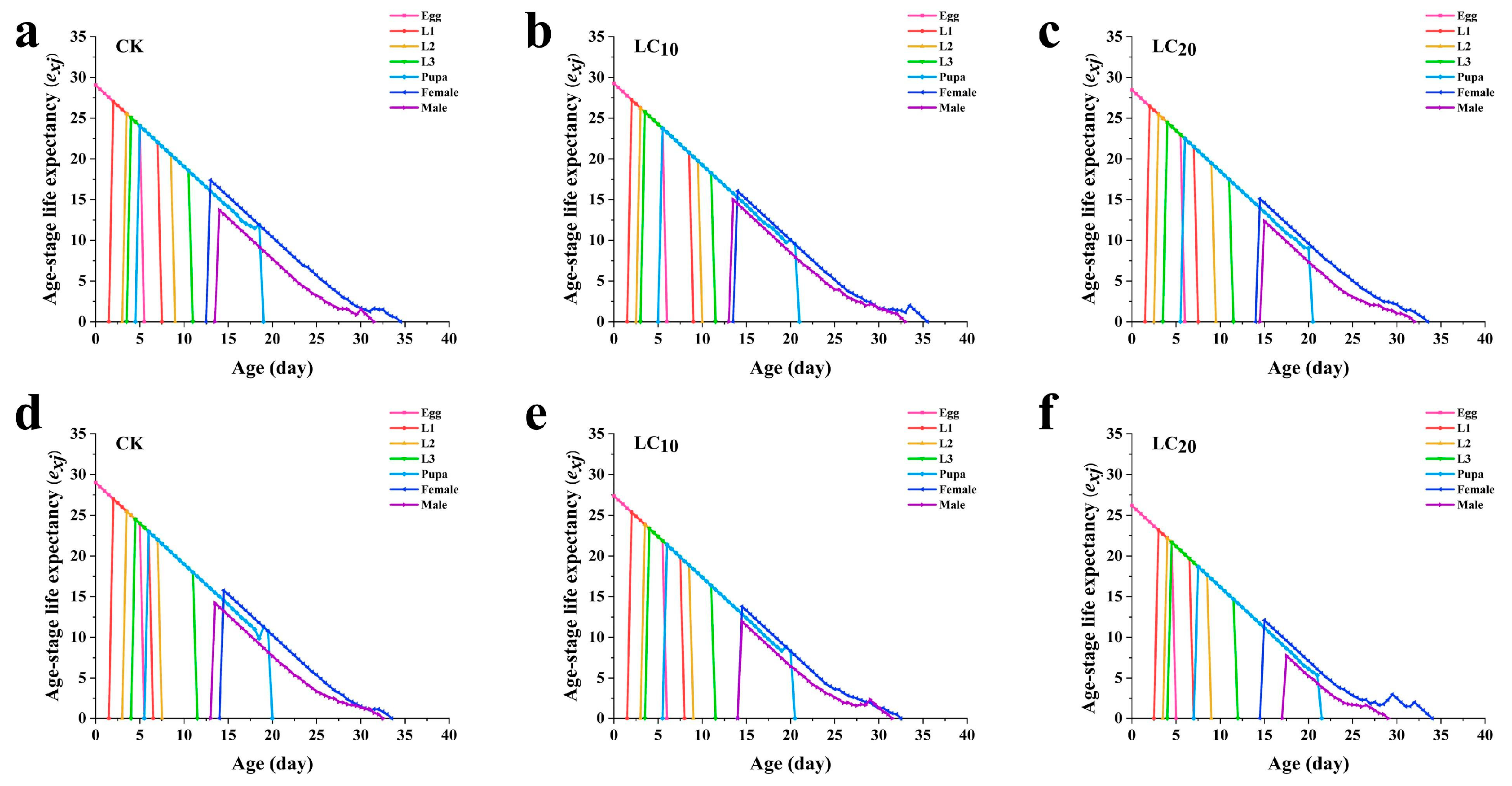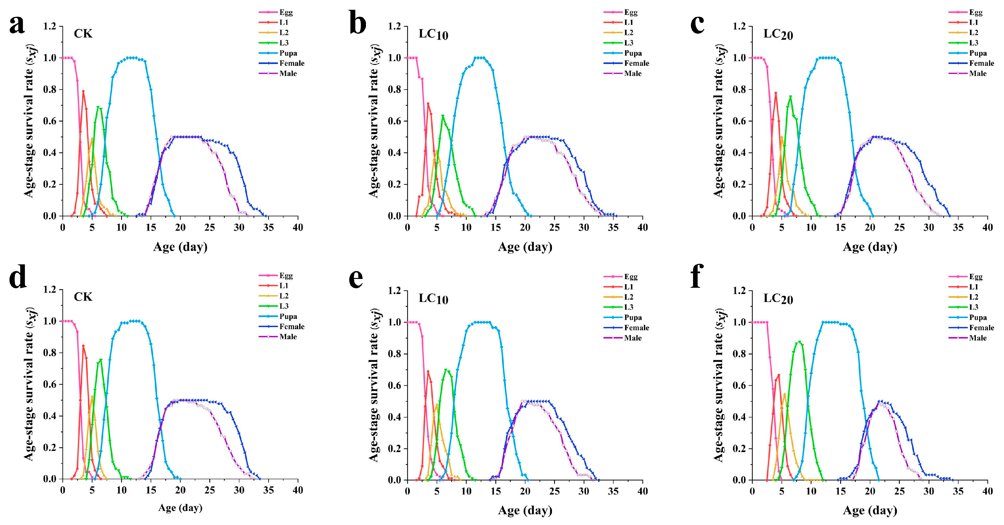 While traditional toxicological assays prioritize acute lethal effects, these metrics frequently underestimate the broader demographic consequences of botanical insecticides. In contrast, the age-stage, two-sex life table provides a more robust framework for evaluating sublethal effects, as it integrates survival, development, and fecundity to project long-term population dynamics. For example, Braga et al. (2025) used the age-stage, two-sex life table methodology and found that treatment with