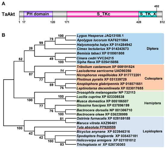 Domain architecture and phylogenetic analysis of TaAkt from T. absoluta. (A) Schematic representation of the conserved domains of the TaAkt protein, including the pleckstrin homology (PH) domain, the serine/threonine protein kinase catalytic domain (S_TKC), and the serine/threonine-type protein kinase extension domain (S_TK_X). (B) Phylogenetic tree of insect Akt proteins is constructed using the neighbor-joining method with 1000 bootstrap replicates. TaAkt is highlighted with a red line, and GenBank accession numbers for each species are listed in the tree.