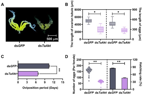 Ovaries from dsGFP-injected females developed normally, with well-formed ovarian tubes containing numerous mature eggs rich in vitellogenin, indicative of healthy reproductive status. In contrast, ovaries from dsTaAkt-injected females exhibited abnormal development: ovarian tubes were reduced in size, and most oocytes remained small and white, suggesting impaired vitellogenesis (Figure 5A). The average ovarian tube length in the dsTaAkt group was 2550 μm, representing a 48% reduction compared with 4930 μm in the control group. Similarly, egg length was significantly reduced to 271 μm after TaAkt knockdown, a 43% decrease relative to 477 μm in the dsGFP group (ovarian tube: t = 12.55, p < 0.001; egg length: t = 11.72, p < 0.001; Figure 5B).