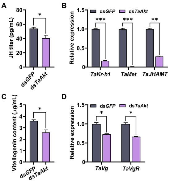 Consistent with these effects on JH signaling, vitellogenin content in 1-day-old adult females was significantly decreased to 2.59 μg/mL, a 28% reduction relative to 3.60 μg/mL in the control group (t = 4.15, p = 0.014; Figure 6C). Furthermore, the relative transcript levels of TaVg and its receptor TaVgR were significantly downregulated by 27% and 34%, respectively, 48 h post-dsTaAkt injection (TaVg: t = 7.46, p = 0.002; TaVgR: t = 9.98, p < 0.001; Figure 6D).