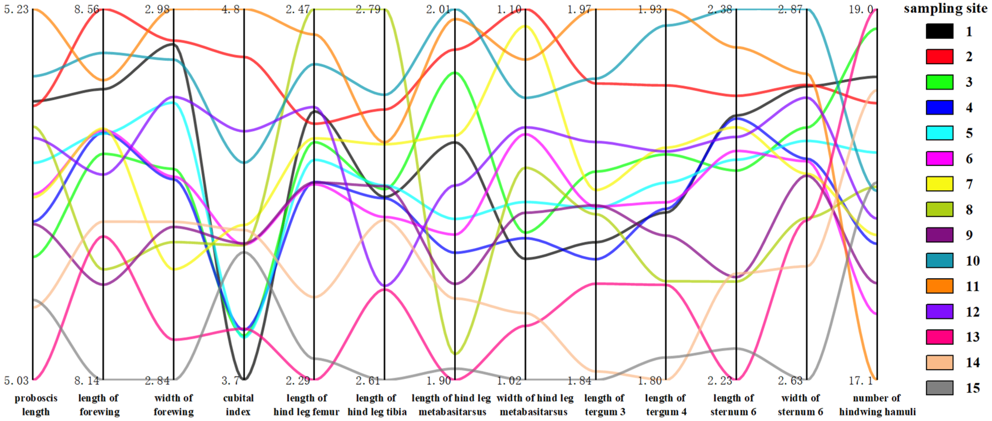 - Yu, L.; Liu, F.; Huang, S.; Bi, S.; Zong, C.; Wang, T. Morphometric analysis of Apis cerana populations in Huangshan, China. J. Apic. Sci. 2013, 57, 117. [Google Scholar]