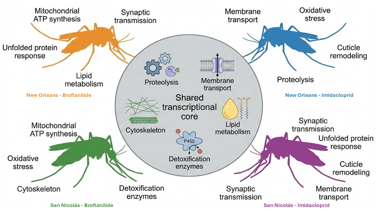 Ae. aegypti strains: a field-derived strain from San Nicolás (Nuevo León, Mexico) and a fully susceptible laboratory strain (New Orleans) free of known resistance mutations and previous insecticide exposure. By comparing the gene expression profiles of survivors across these strain–insecticide combinations, we aim to identify detoxification pathways and other stress-related genes that are differentially regulated in response to each compound. Generating this baseline information before the widespread use of these molecules in vector control could help anticipate potential resistance mechanisms and inform the design of more sustainable insecticide rotation strategies.