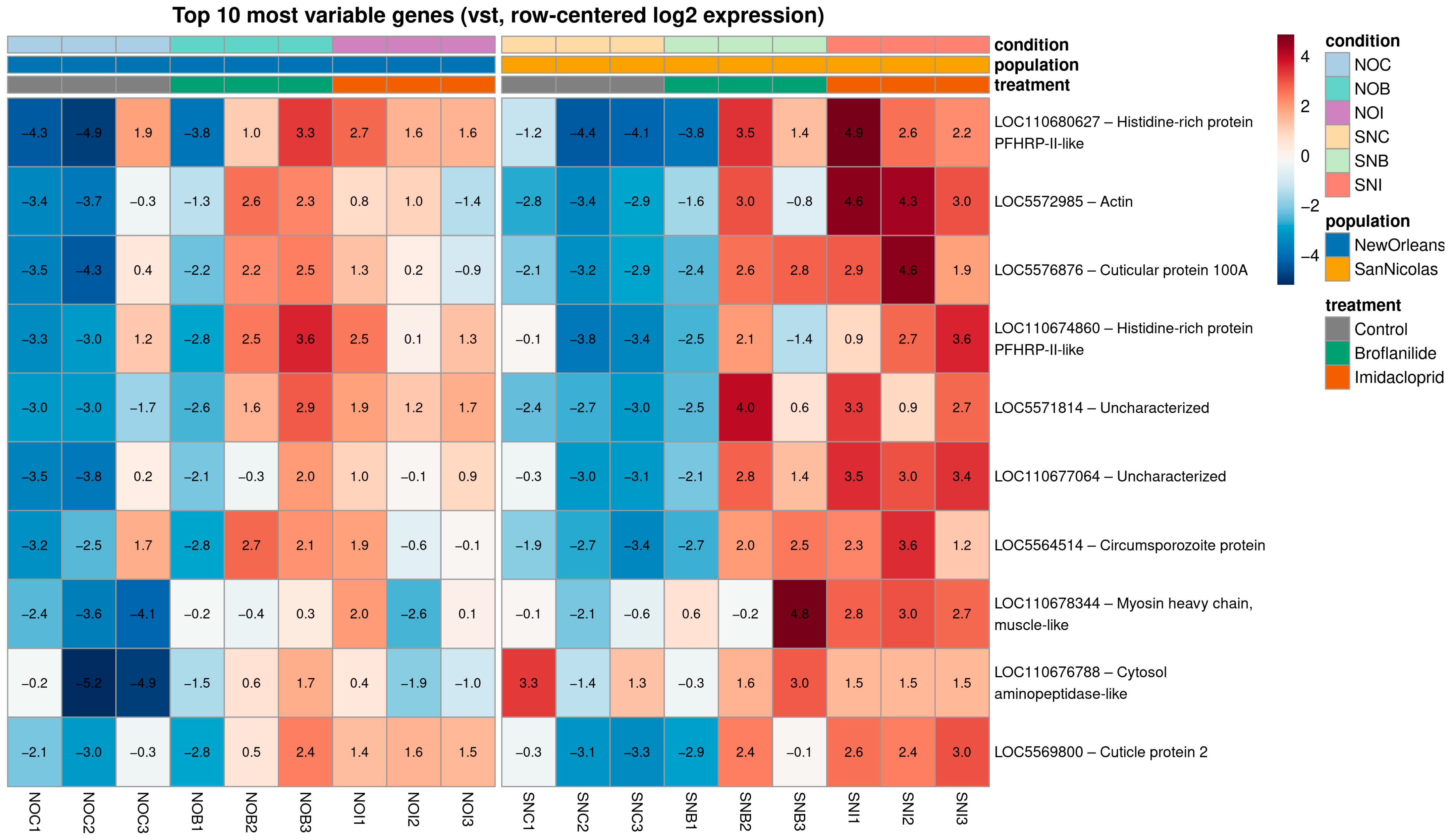 17]. We deliberately restricted this visualization to 10 loci to keep the figure and interpretation tractable and to focus on the genes showing the strongest variance across samples, as an illustrative example rather than a comprehensive ranking. These quality control plots were used to verify clustering of biological replicates, detect potential outliers and characterize the relative contribution of population and insecticide treatment to the overall transcriptomic structure.