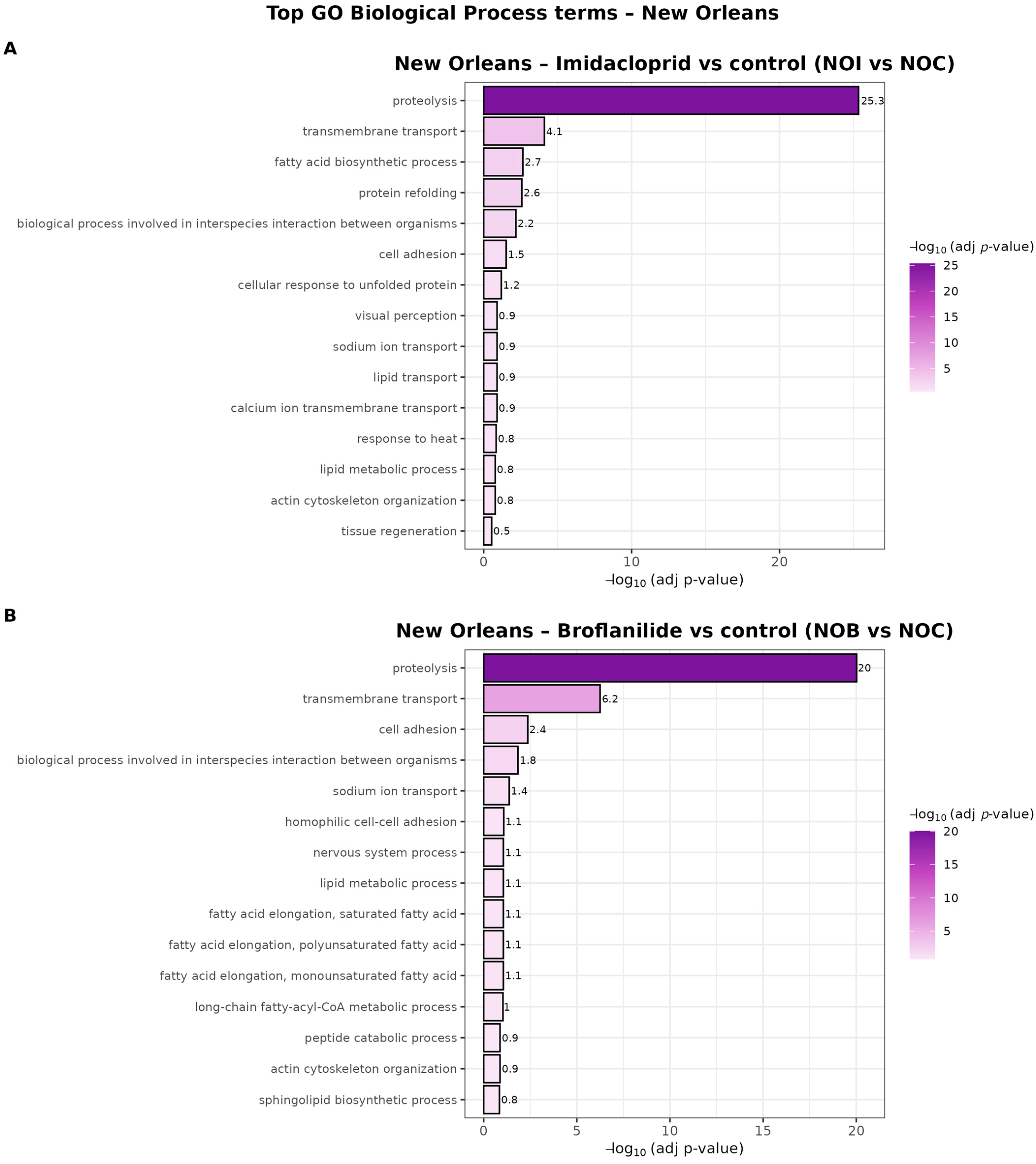 The comparison between NO and SN also revealed interesting differences in energy metabolism and stress responses. In the NO strain, both insecticides shared a strongly convergent Biological Process profile centered on proteolysis and transmembrane transport, with broflanilide more prominently associated with lipid metabolism and neuronal processes, and imidacloprid more prominently associated with protein refolding and tissue regeneration. In SN, broflanilide exposure was characterized by enrichment of mitochondrial energy metabolism (proton motive force-driven ATP synthesis, tricarboxylic acid cycle) together with actin cytoskeleton organization and synaptic transmission, whereas imidacloprid combined the proteolysis–transport core with additional processes related to oxidative stress, carbohydrate metabolism and ion transport. These patterns are consistent with a scenario in which both compounds engage a shared set of stress and detoxification pathways, while broflanilide elicits a stronger mitochondrial and synaptic signature and imidacloprid more strongly activates proteostasis, oxidative stress defenses and broader metabolic remodeling.