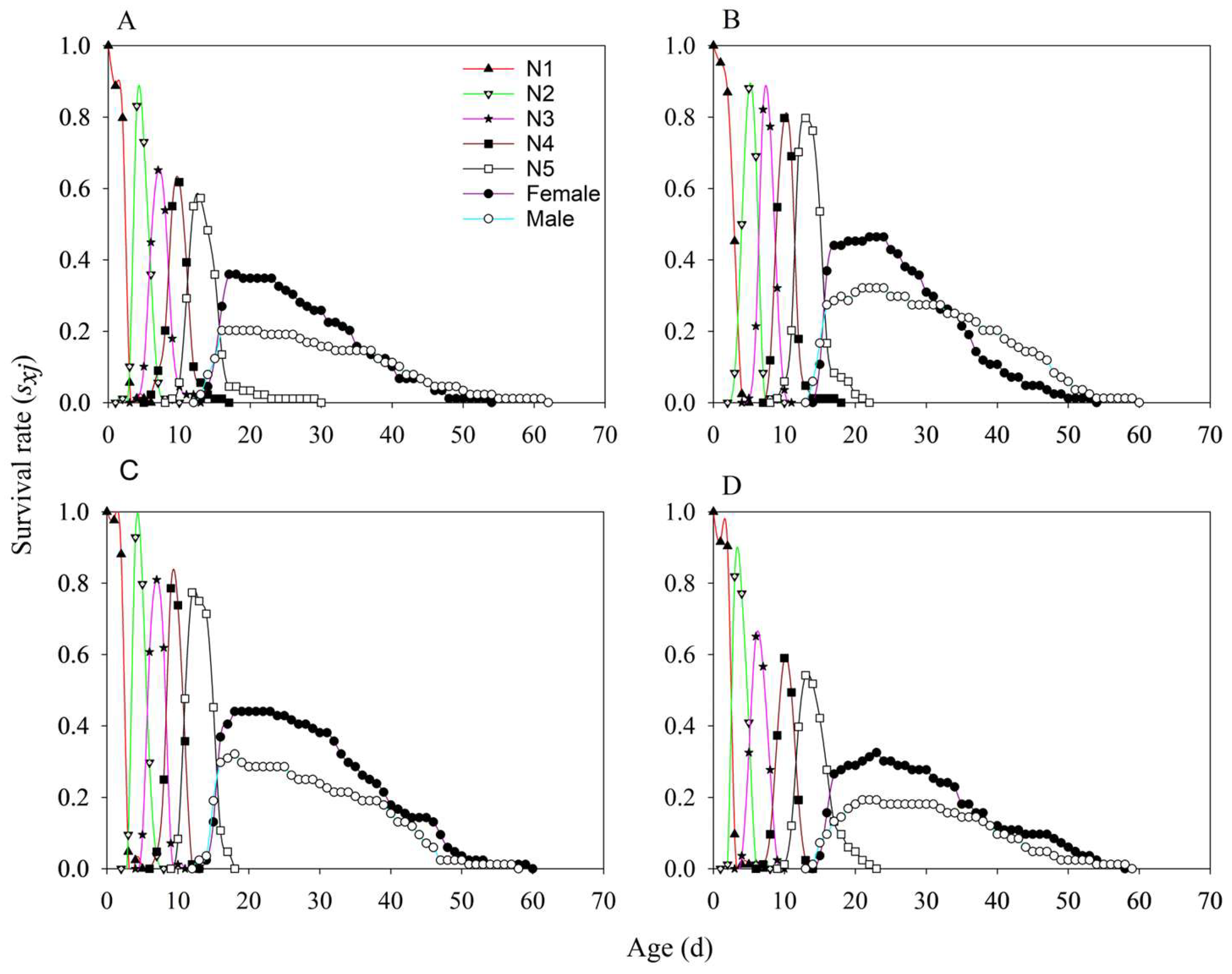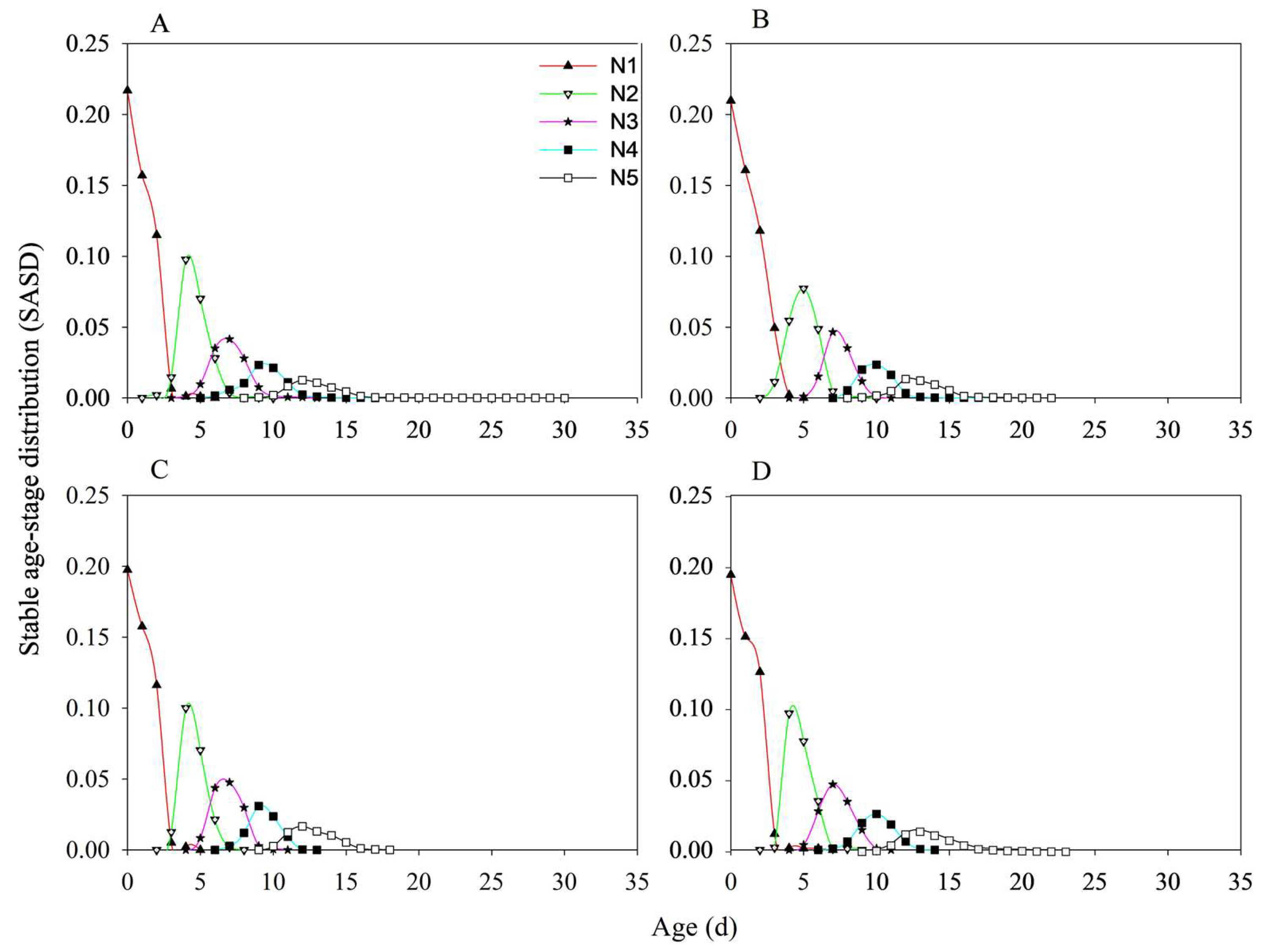 3.3. Stable Age-Stage Distribution of Nymphs (SASD)