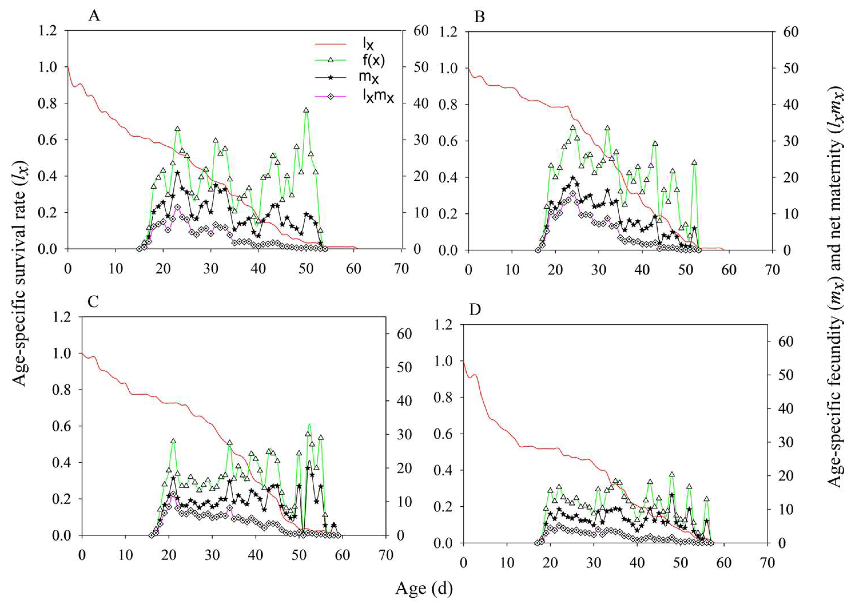 | Net reproductive rate | MH86 | 129.449 ± 24.021 a | 189.298 ± 30.262 a |