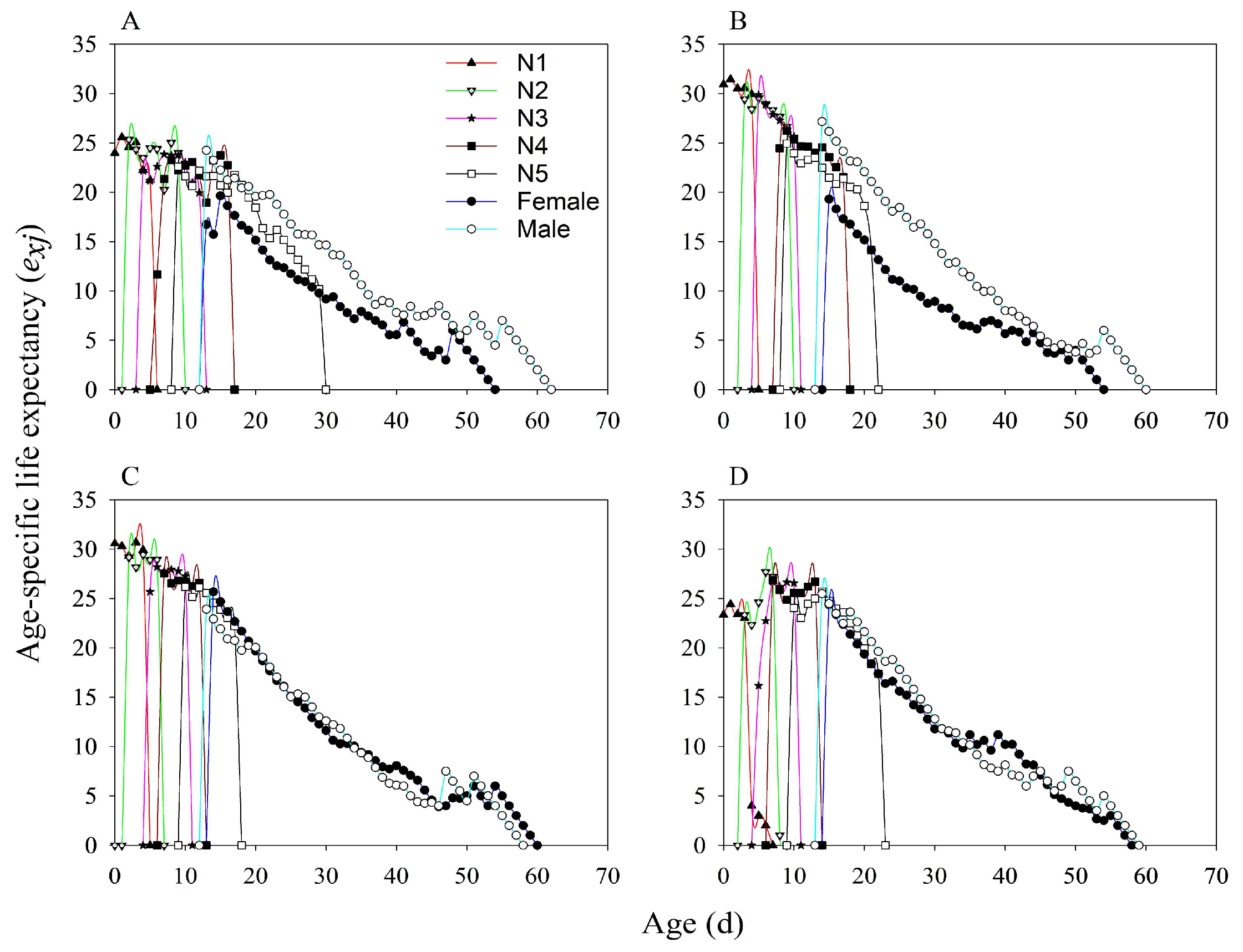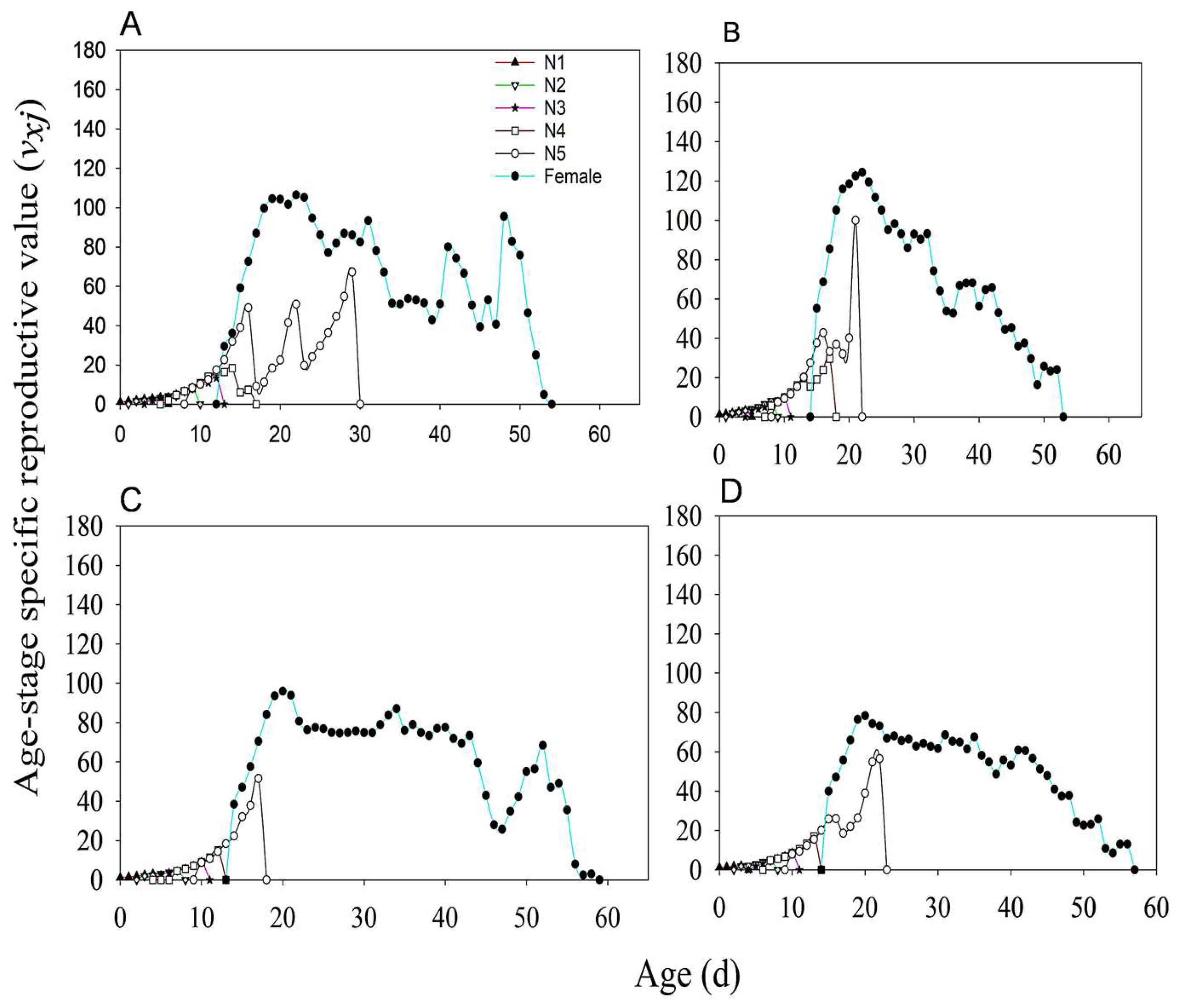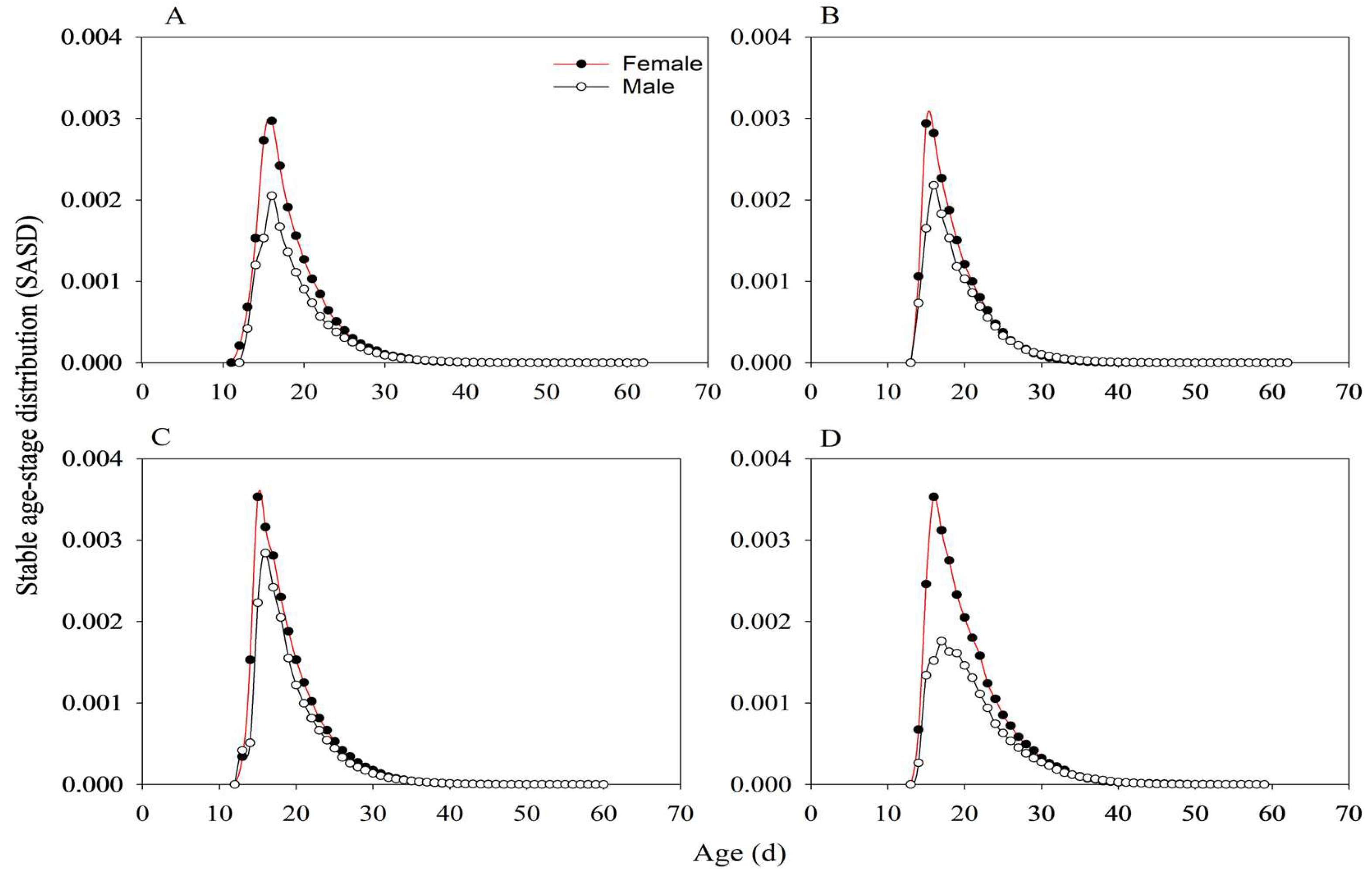 3.4. Stable Age-Stage Distribution of Adults (SASD)