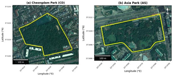 Study site locations with aerial imagery: (a) Cheongdam Park (CD) and (b) Asian Park (AS) in Seoul, South Korea. Yellow lines denote park boundaries (source: Seoul Open Data Portal). Base imagery: National Geographic Information Institute.
