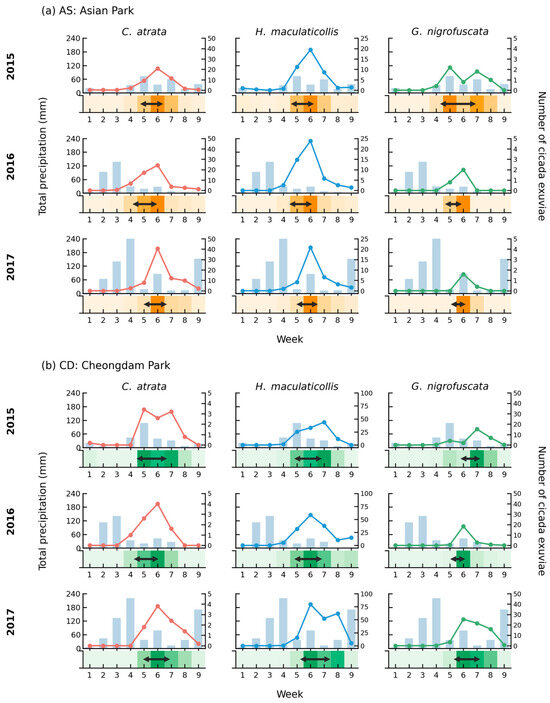 Comparison of weekly cicada emergence peaks and associated precipitation patterns for three species—C. atrata, H. maculaticollis, and G. nigrofuscata—in two urban parks: (a) AS (Asian Park) and (b) CD (Cheongdam Park). Panels are arranged in a 3 × 3 grid (rows: 2015–2017; columns: species). Within each panel, bars show weekly total precipitation (mm; left y-axis) and lines show the number of cicada exuviae collected (right y-axis). Line colors correspond to each species (red: C. atrata; blue: H. maculaticollis; green: G. nigrofuscata). The bottom heat strip represents weekly emergence intensity normalized to the 0–1 range using min–max scaling, with orange indicating AS and green indicating CD. Arrow bars indicate the interquartile range (IQR) of emergence weeks. Weekly units cover nine study weeks (late June–late August) for each year.