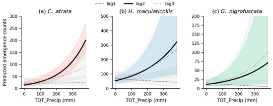 Predicted emergence counts as a function of antecedent precipitation based on Poisson generalized estimating equations (GEEs) for three cicada species: (a) C. atrata, (b) H. maculaticollis, and (c) G. nigrofuscata. Curves represent model-predicted counts for each lag interval (dashed gray: lag1, 1 week prior; solid black: lag2, 2 weeks prior; dotted gray: lag3, 3 weeks prior). Shaded bands indicate 95% confidence intervals, with species-colored bands for lag2 and gray bands for lag1 and lag3.